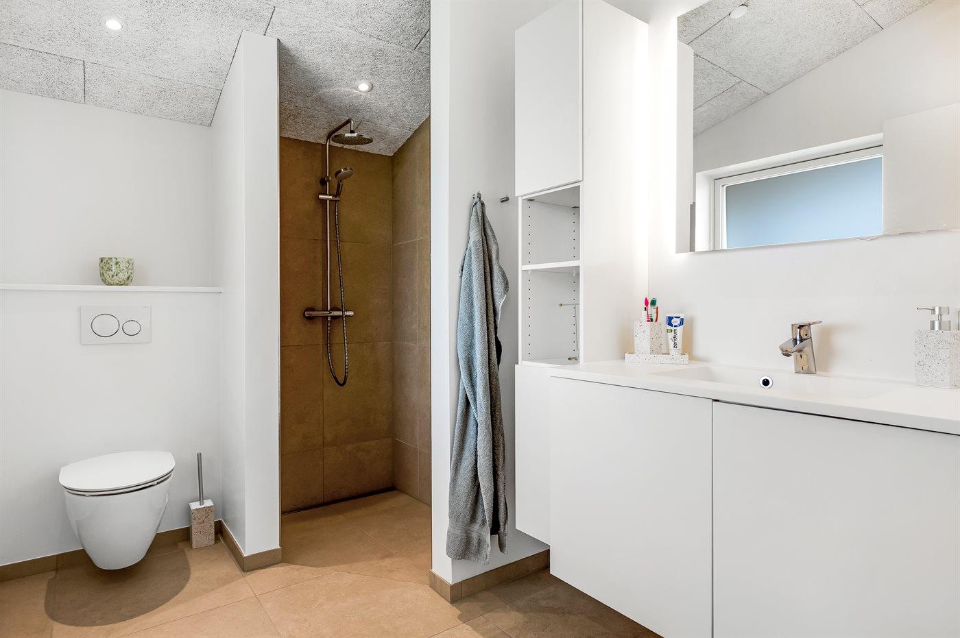 Der er 1 badeværelse med bruseniche og 1 toilet.. Der er gulvvarme på 1 badeværelse.