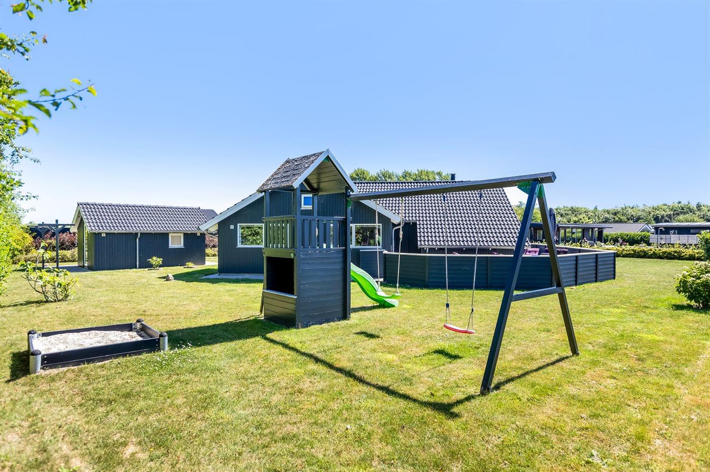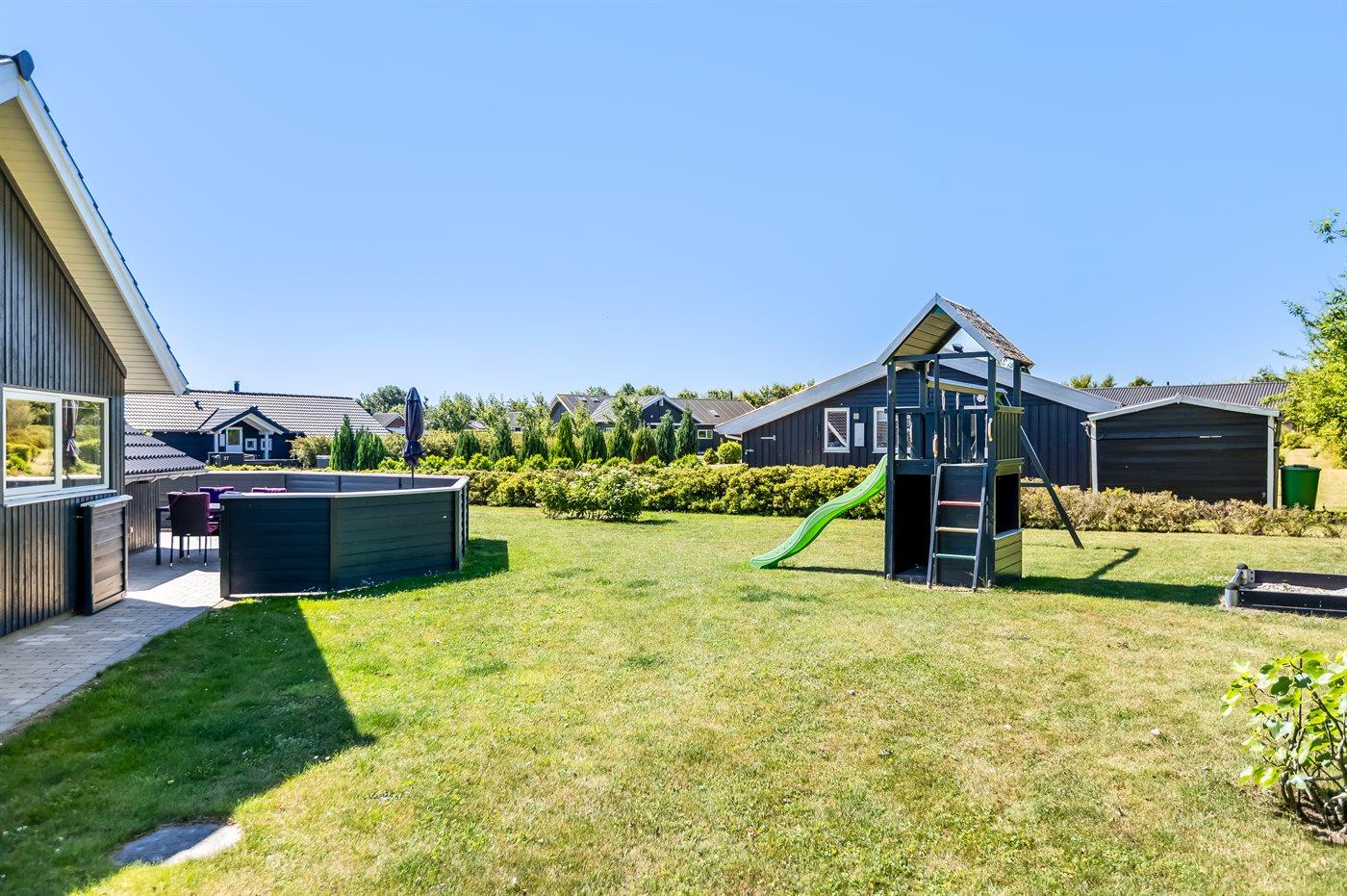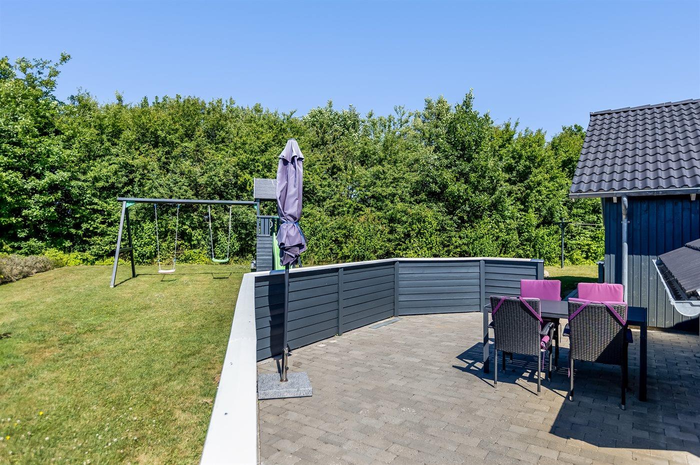 Ferieboligen er beliggende på en 1050 m² stor havegrund. Der er 700 m til havet. Nærmeste forretning er beliggende i en afstand af 2000 m. Der er en golfbane i en afstand af 14000 m. Til ferieboligen hører åbent terrasseareal. Desuden er der overdækket terrasse. Gynge. Sandkasse. Legetårn. Grill til rådighed. Der er installeret stik til opladning af elbil. Type 2 stik. Med 11 kW ladeeffekt. Parkering ved ferieboligen.