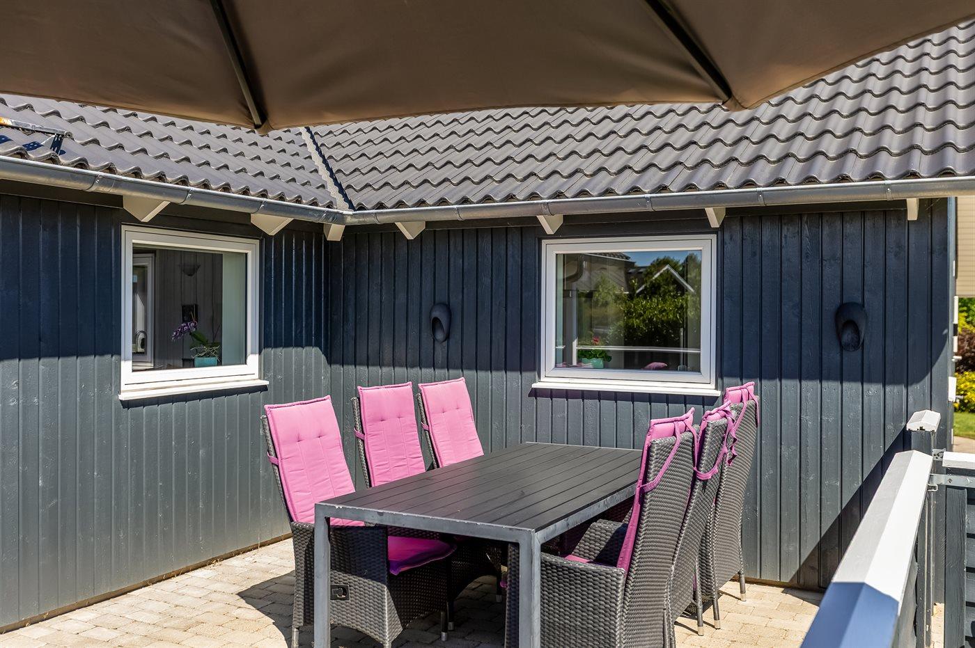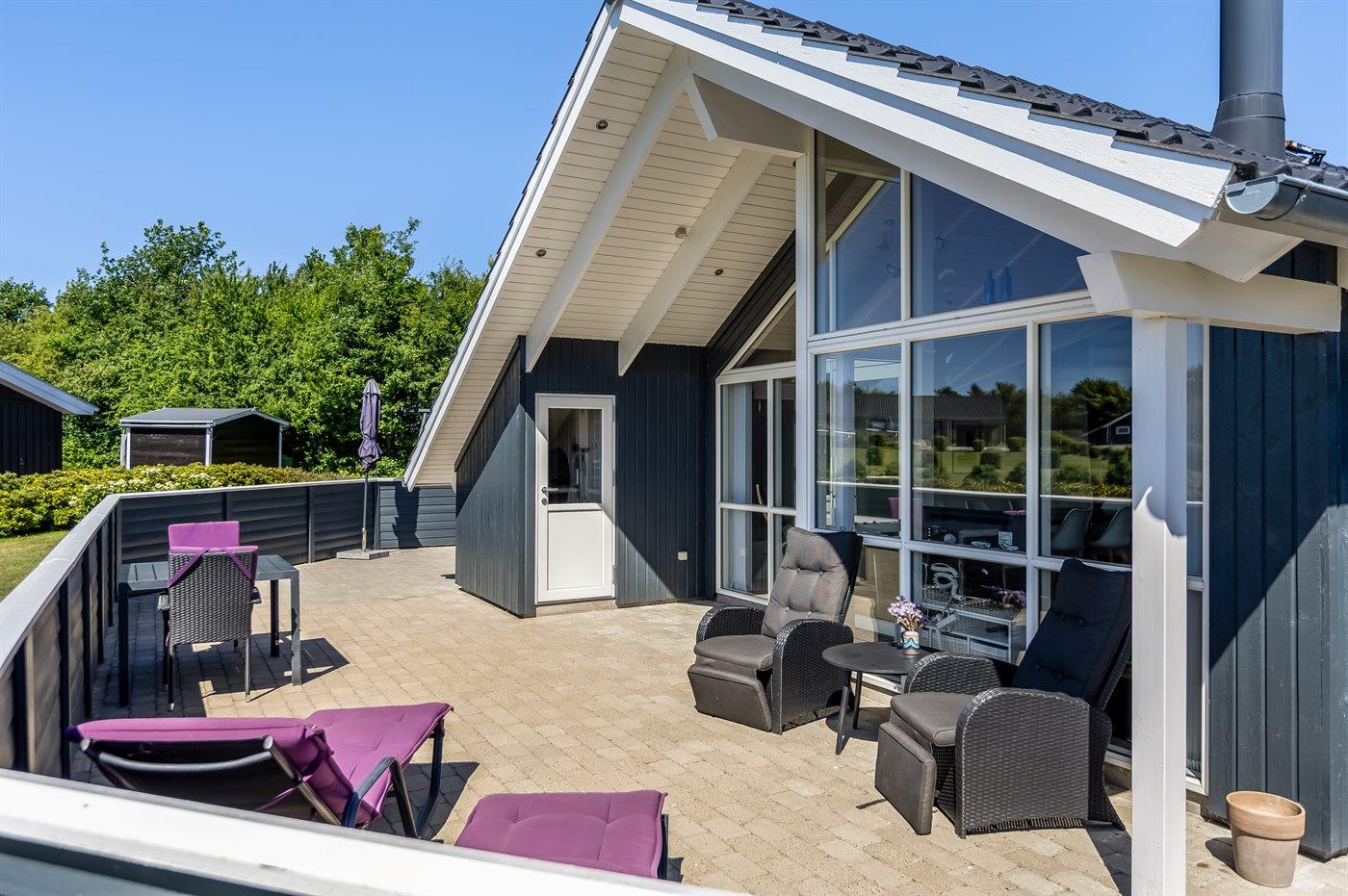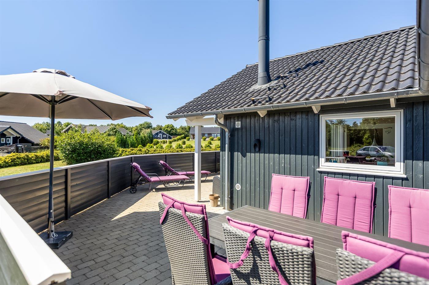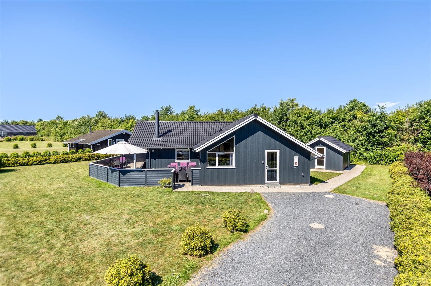 Ferieboligen er beliggende på en 1050 m² stor havegrund. Der er 700 m til havet. Nærmeste forretning er beliggende i en afstand af 2000 m. Der er en golfbane i en afstand af 14000 m. Til ferieboligen hører åbent terrasseareal. Desuden er der overdækket terrasse. Gynge. Sandkasse. Legetårn. Grill til rådighed. Der er installeret stik til opladning af elbil. Type 2 stik. Med 11 kW ladeeffekt. Parkering ved ferieboligen.