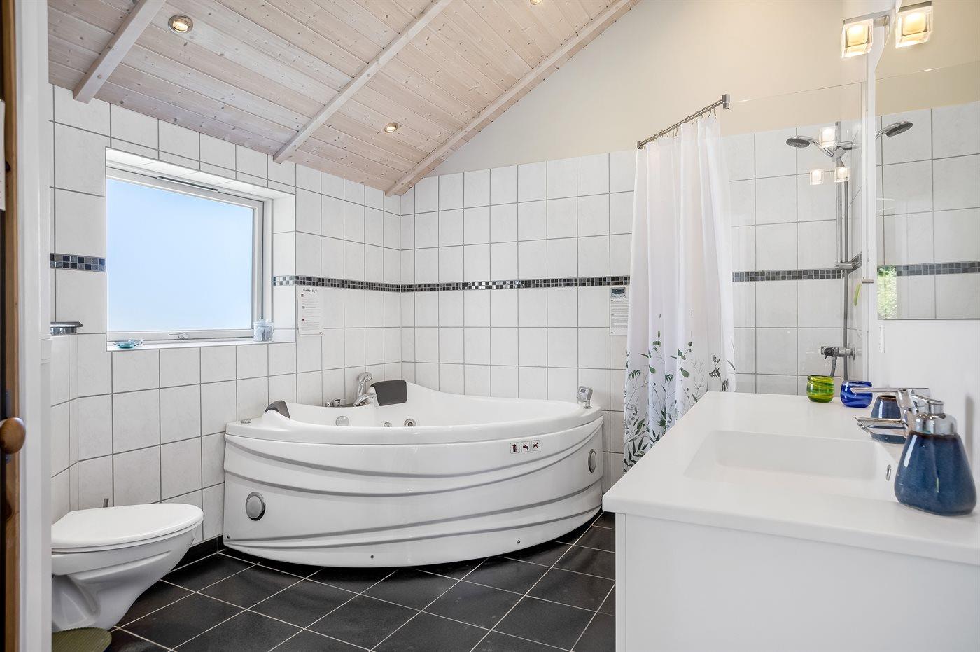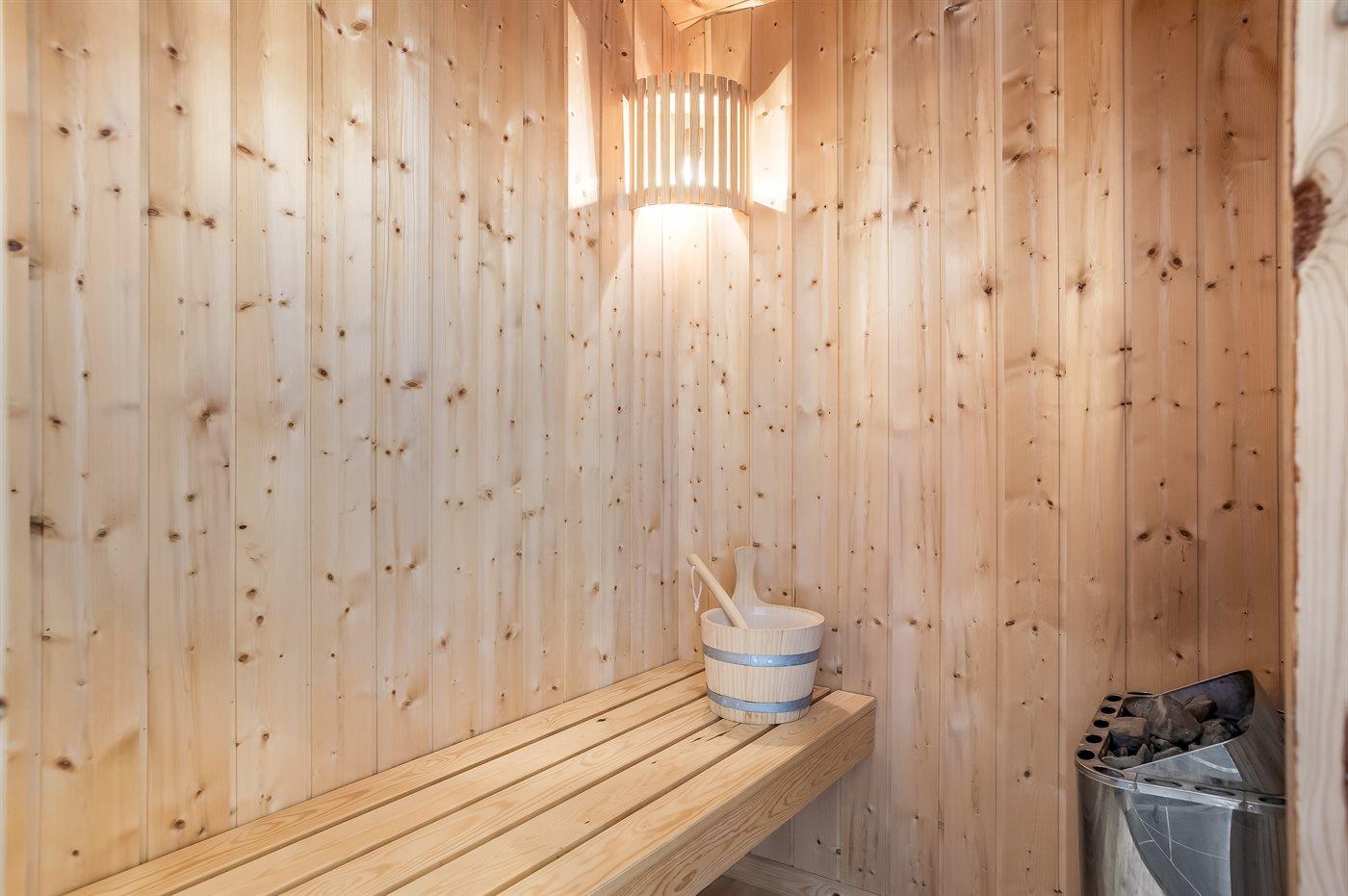 Der er 1 badeværelse med bruseniche og 1 toilet.. Der er gulvvarme på 1 badeværelse. I saunaen er der mulighed for afslapning.