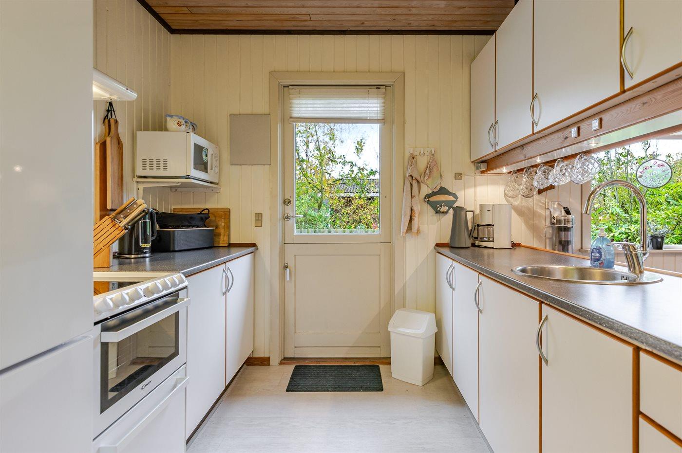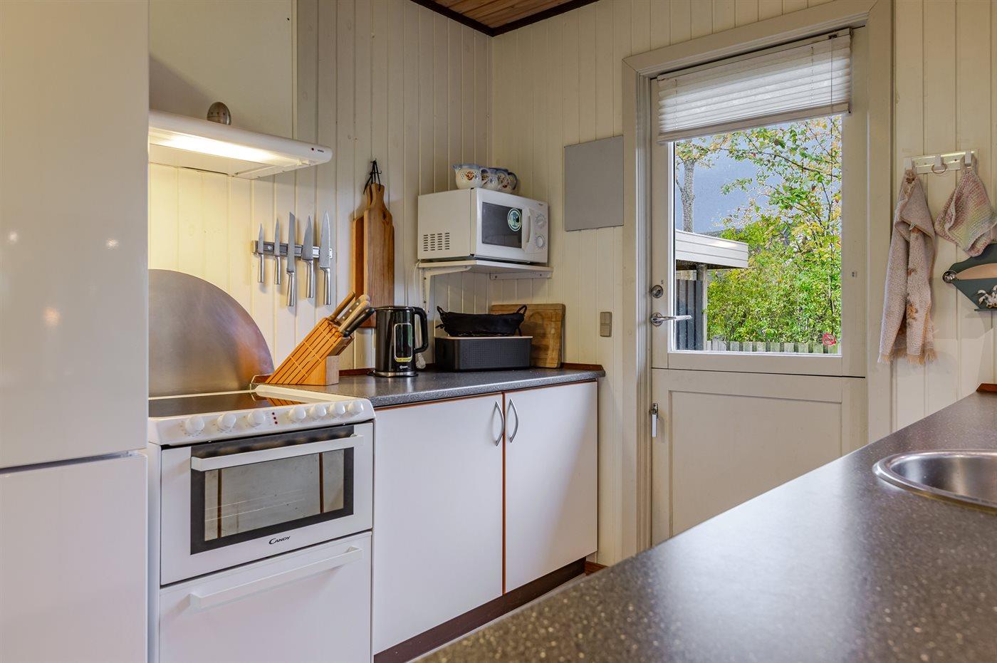 Køkkenet er udstyret med 1 køleskab. Der er 4 keramiske kogeplader. Mikrobølgeovn. Ferieboligen har kombineret komfur (med ovn) og opvaskemaskine.