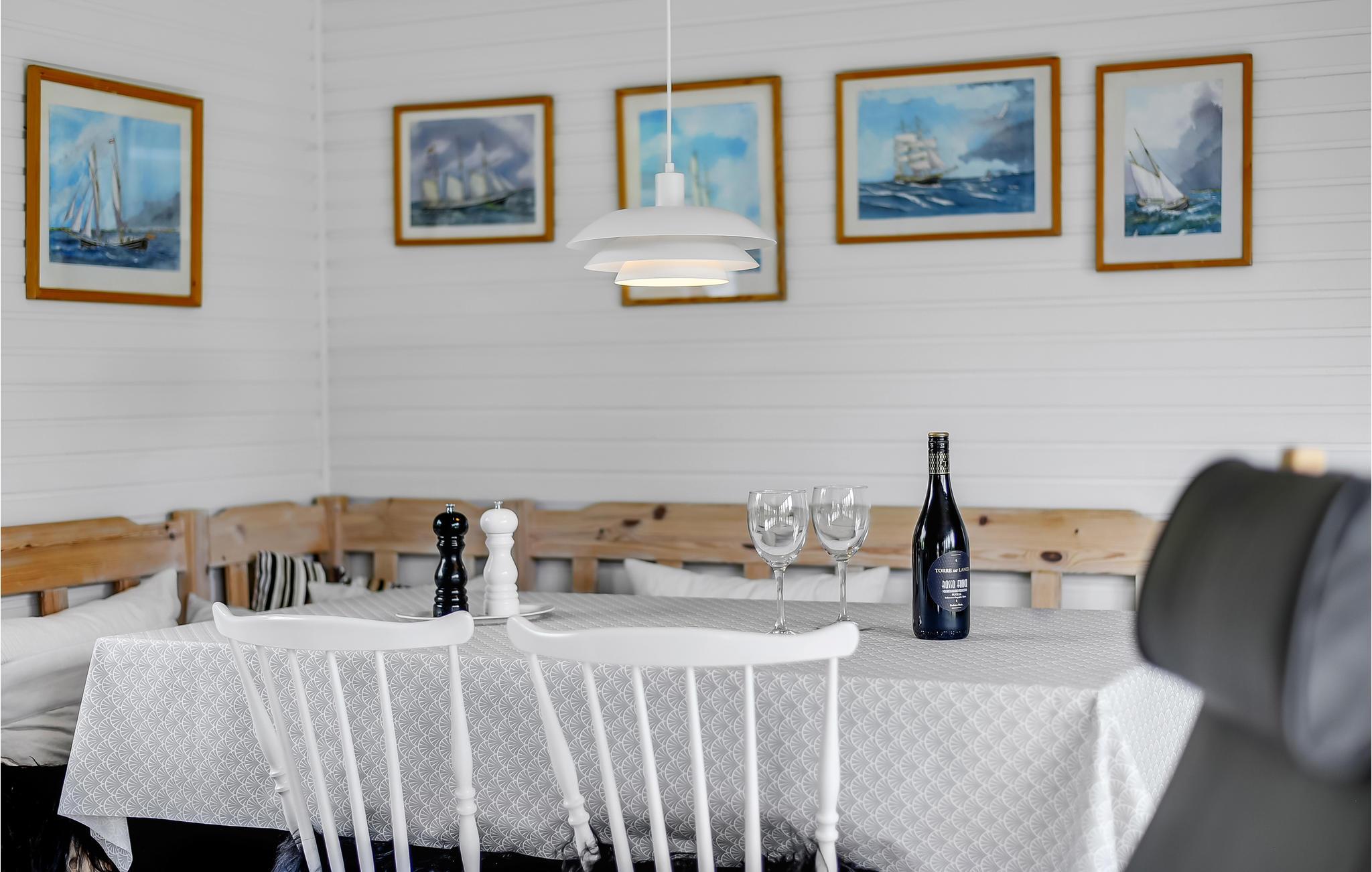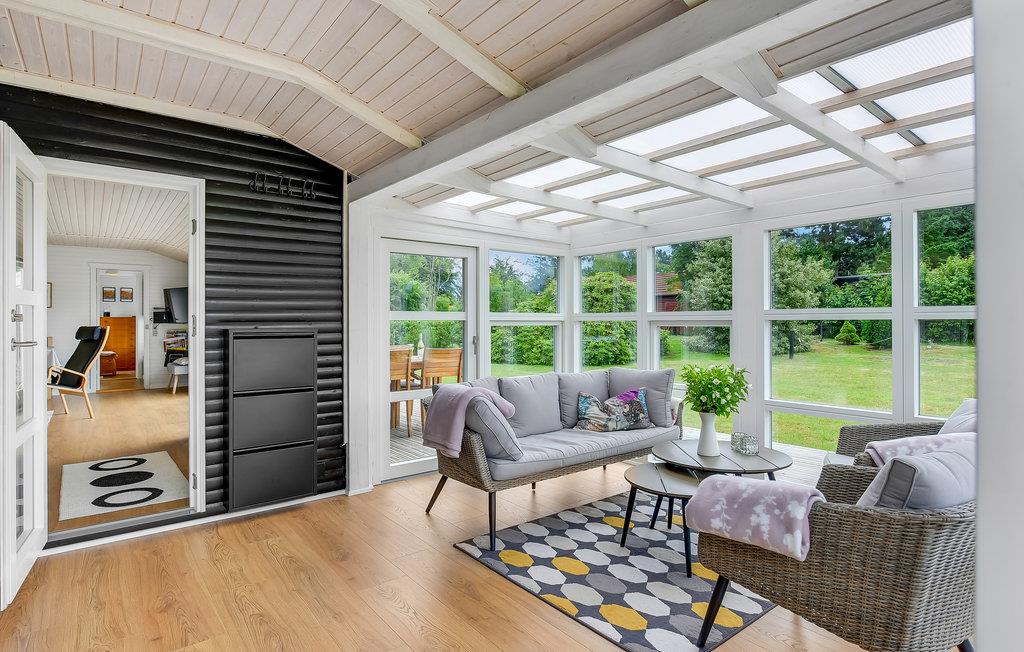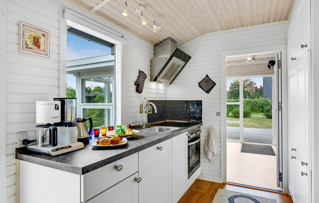 Dette hyggelige feriehus er beliggende i 2. række, kun 100 meter fra vandet. En lille sti fører direkte ned til den dejlige strand og Østersøens rene badevand. Husets moderne og veludstyret køkken ligger i åben forbindelse med spiseafdelingen og opholdsstuen. I stuen er der både en brændeovn og en energivenlig varmepumpe, som I kan bruge på de kølige dage og aftener. Overalt vil I opleve lyse og indbydende rum. Der er også en dejlig havestue, hvor I kan nyde naturen indefra, hvis vejret ikke er til udendørs aktiviteter. Over alt i huset kan I bruge den trådløse internetforbindelse.