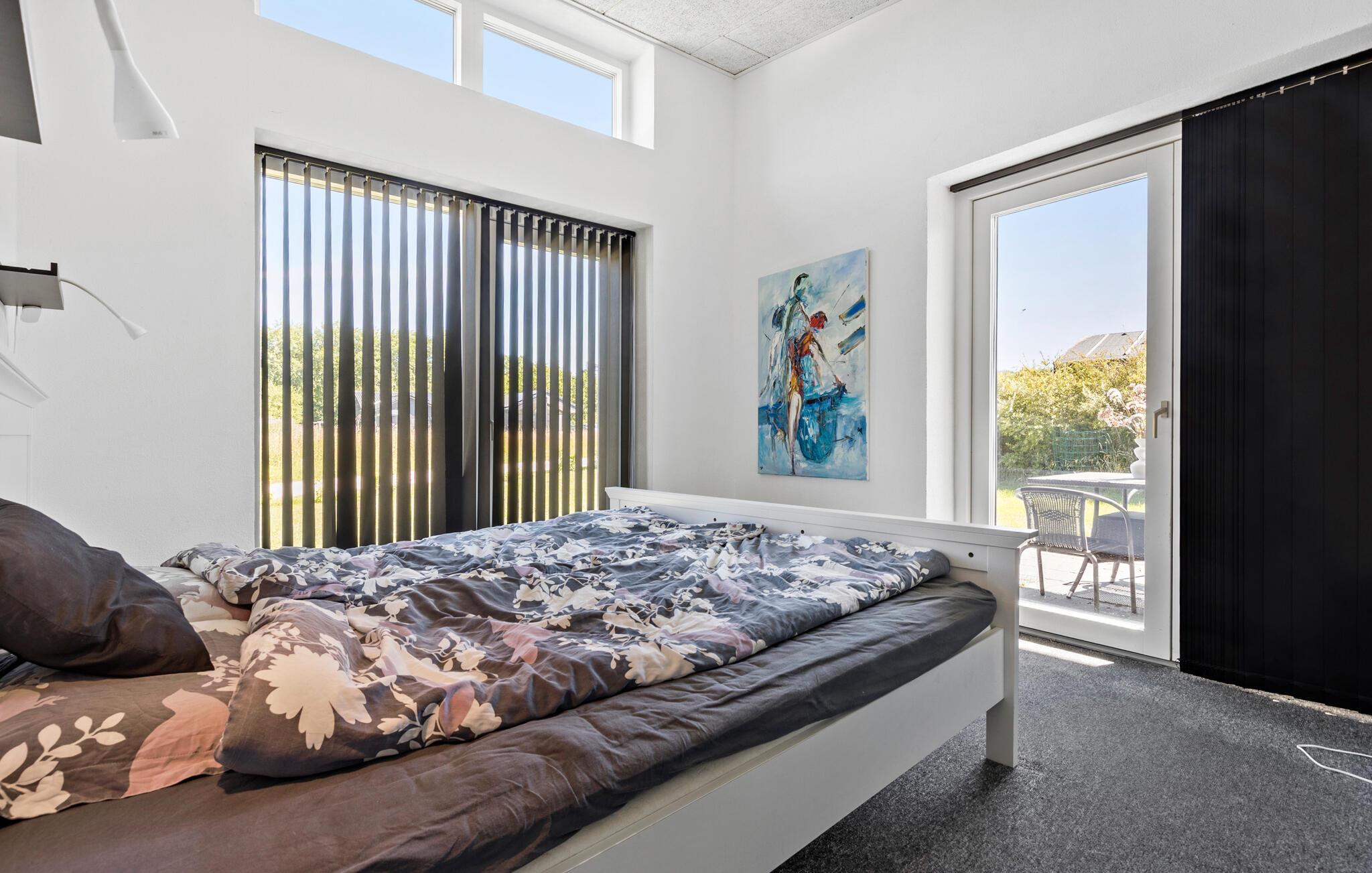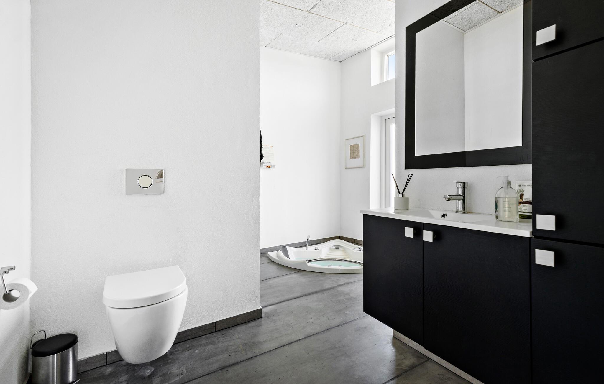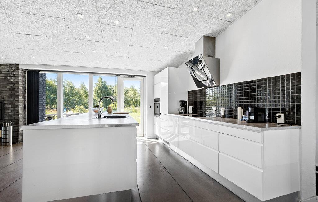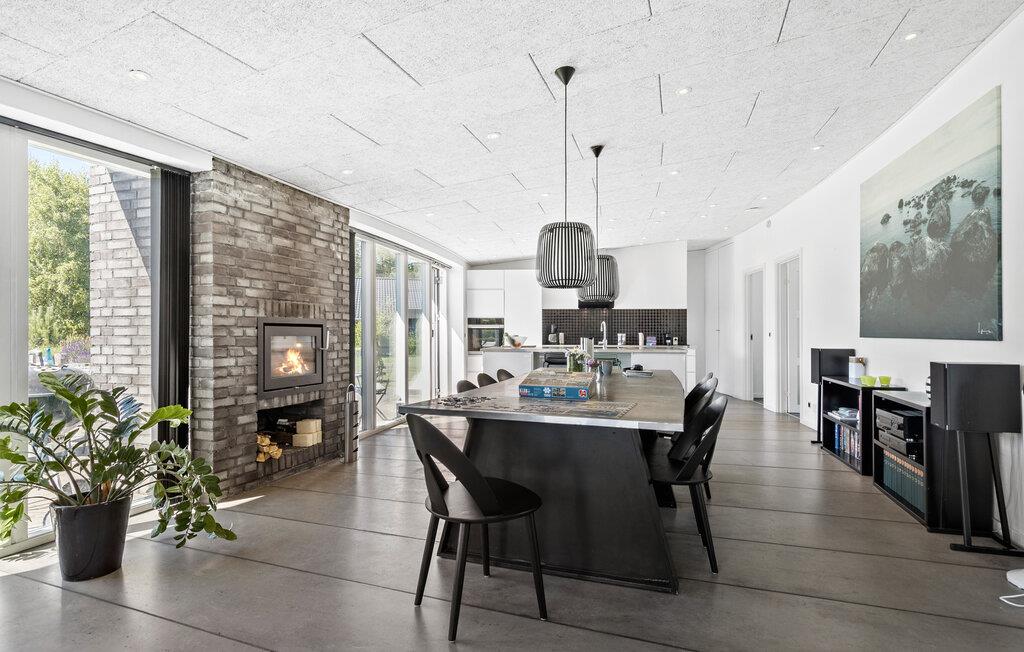 Dette rummelige feriehus ligger kun en kort gåtur fra havet og har en lys og stilfuld opholdsstue. Glæd jer til hyggelige madlavningsstunder i det åbne køkken, nyd hyggelige måltider med udsigt over haven, og forkæl jer selv med afslappende øjeblikke i saunaen eller spabadet, mens andre spiller PlayStation eller tænder brændeovnen til en hyggelig spilleaften.