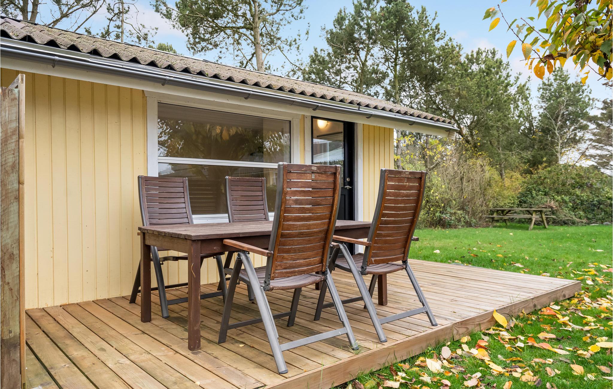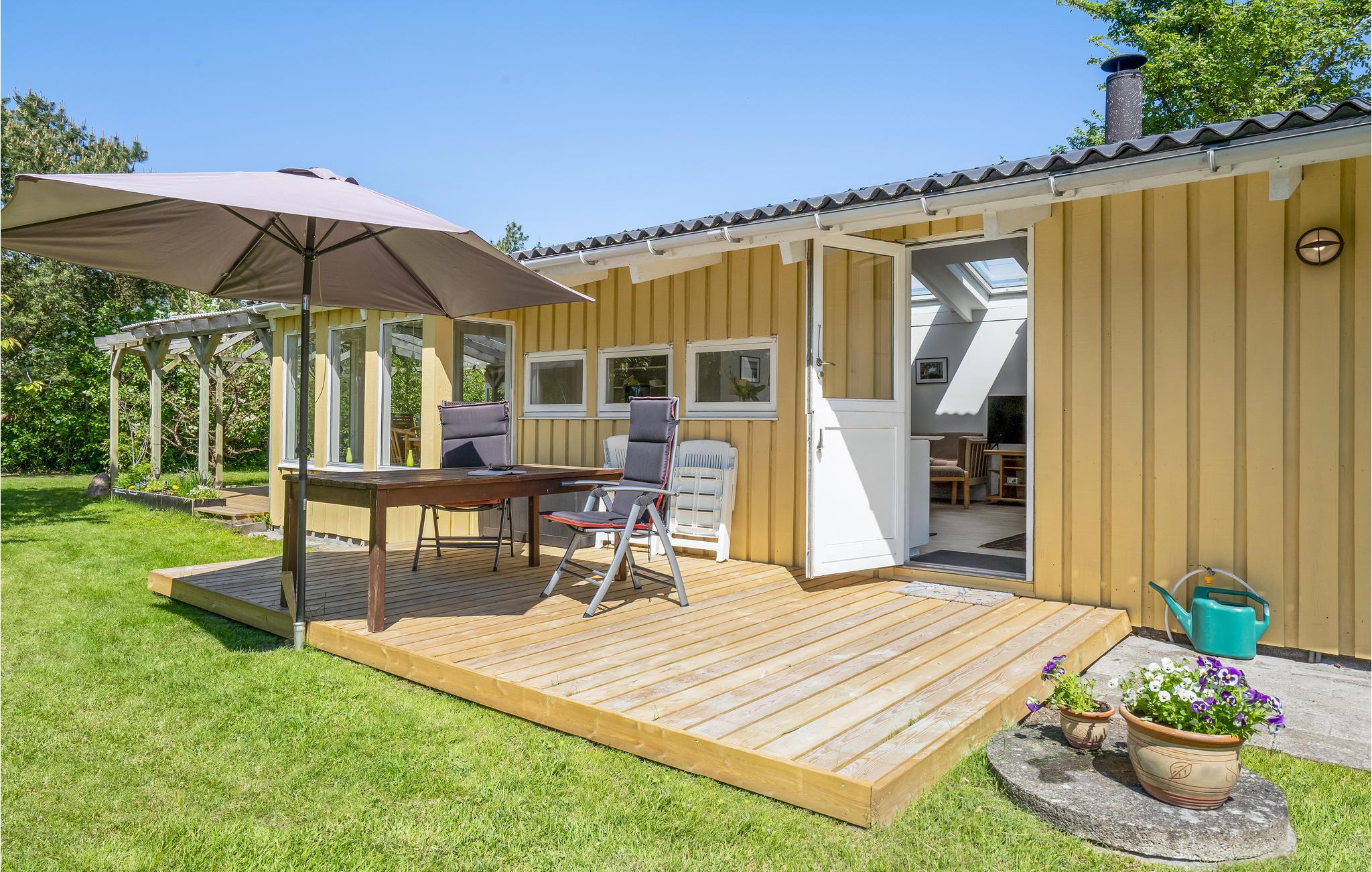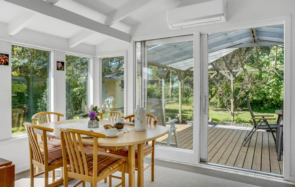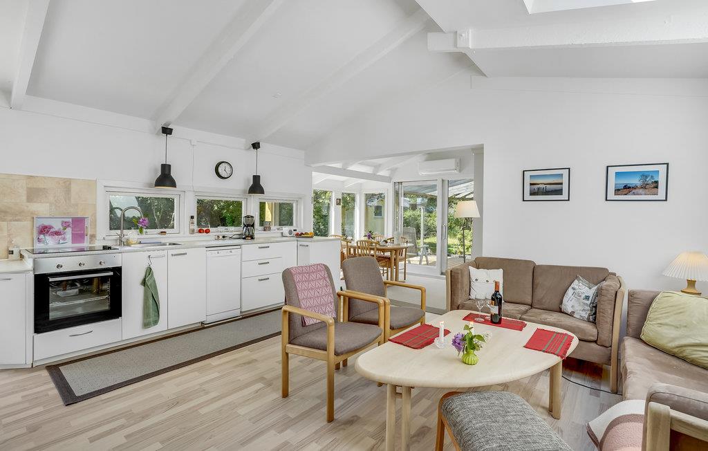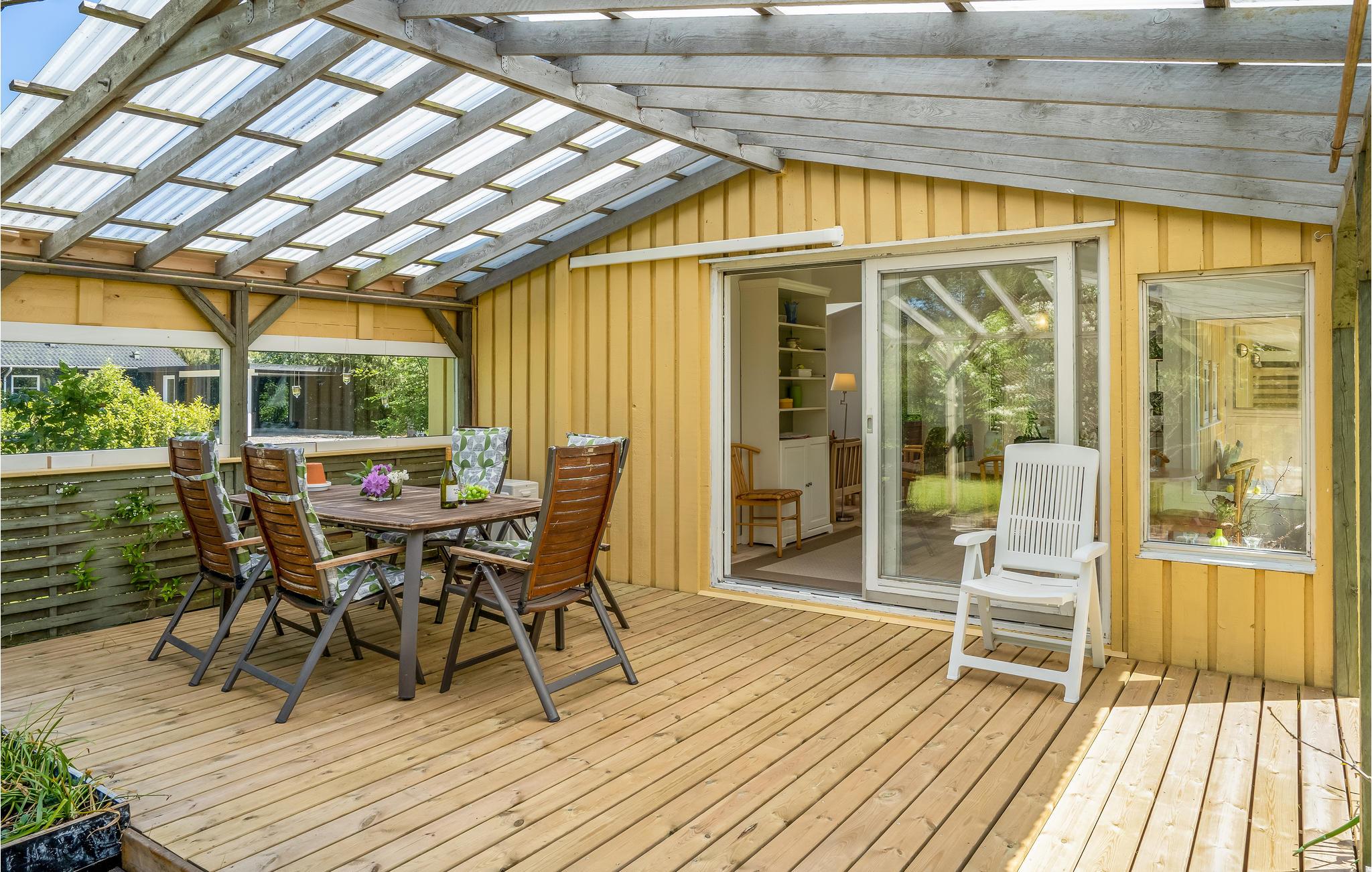 Velkommen indenfor i dette indbydende sommerhus, hvor ovenlysvinduerne og de dæmpede farvertoner sørger for et smukt naturligt lys. Sæt jer sammen og nyd feriens måltider eller spil brætspil ved spisebordet, hovrfra I kan nyde en smuk udsigt over det omkringliggende grønne område gennem de store vinduer. Gør jer komfortable sammen i det hyggelige opholdsområde og fyr op i brændeovnen om aftenen, hvor en knitrende ild skaber en hyggelig atmosfære. Nyd morgenkaffen på terrassen, mens I planlægger dagens aktiviteter. Senere kan I forlænge de lune sommeraftener ved at sætte jer under den overdækkede terrasse og nyde en lækker grillmiddag. Annekset tilbyder ekstra plads og privatliv og her finder endnu en dejlig terrasse.