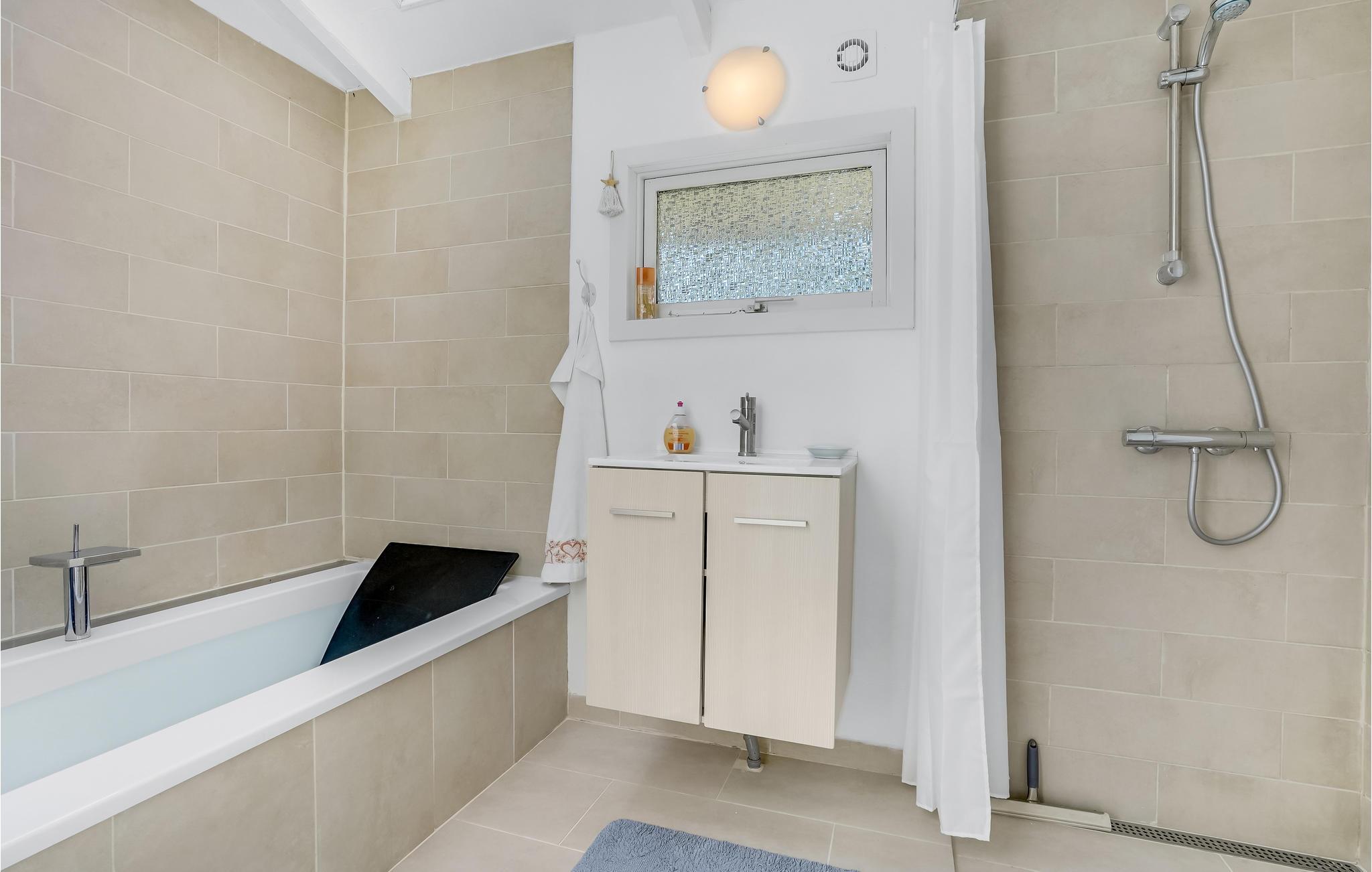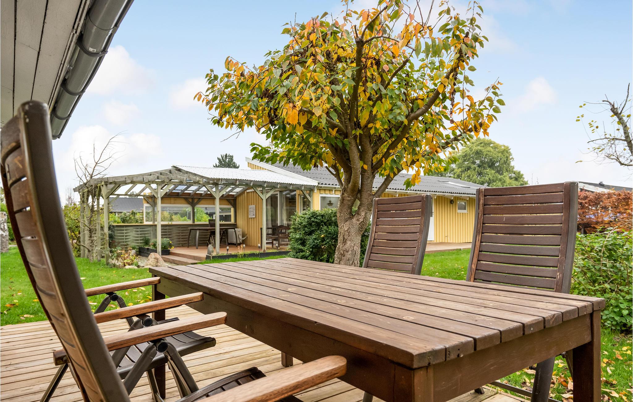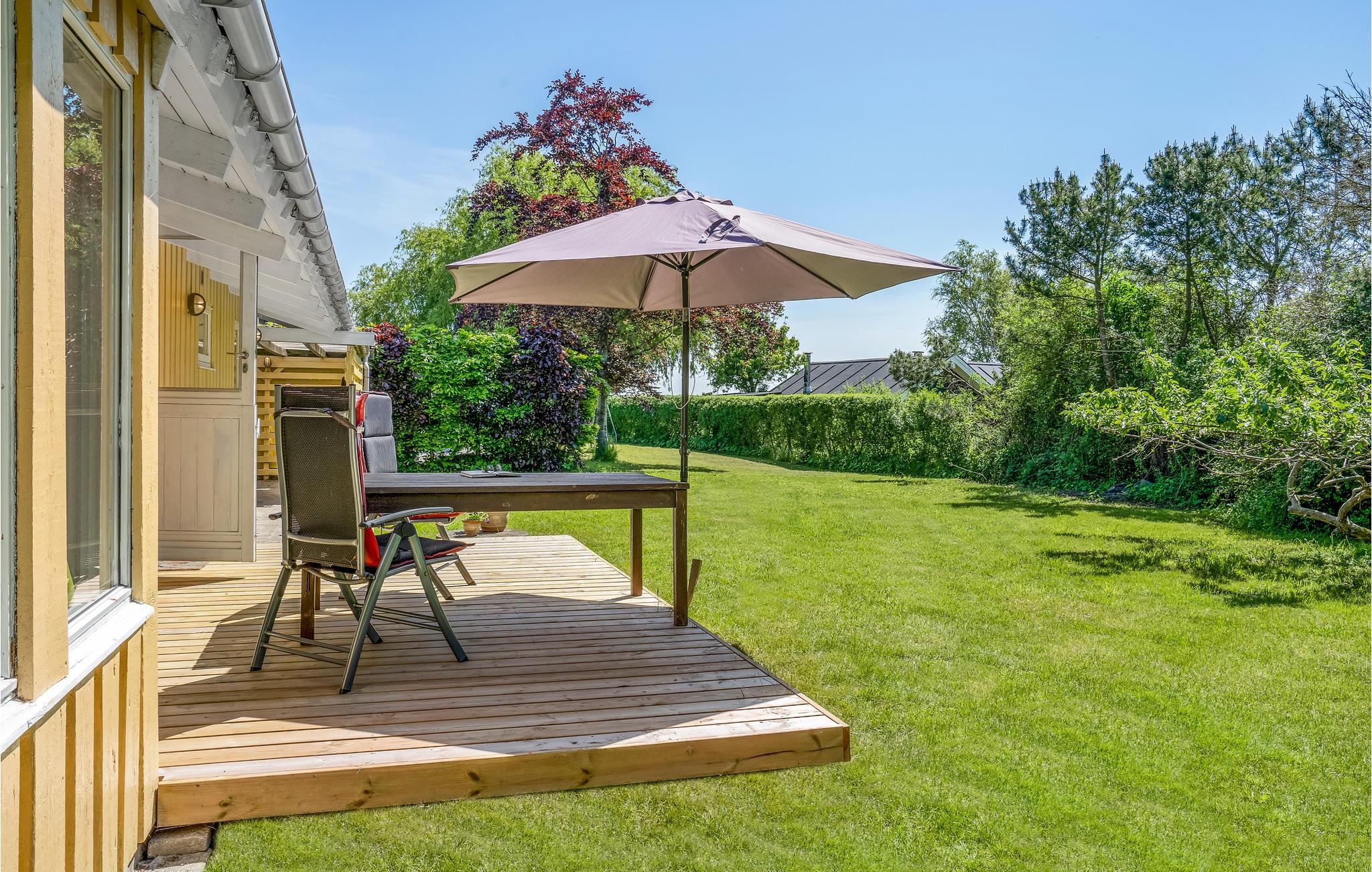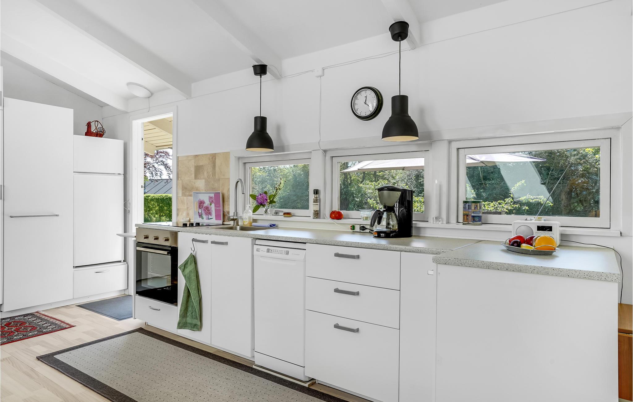 Velkommen indenfor i dette indbydende sommerhus, hvor ovenlysvinduerne og de dæmpede farvertoner sørger for et smukt naturligt lys. Sæt jer sammen og nyd feriens måltider eller spil brætspil ved spisebordet, hovrfra I kan nyde en smuk udsigt over det omkringliggende grønne område gennem de store vinduer. Gør jer komfortable sammen i det hyggelige opholdsområde og fyr op i brændeovnen om aftenen, hvor en knitrende ild skaber en hyggelig atmosfære. Nyd morgenkaffen på terrassen, mens I planlægger dagens aktiviteter. Senere kan I forlænge de lune sommeraftener ved at sætte jer under den overdækkede terrasse og nyde en lækker grillmiddag. Annekset tilbyder ekstra plads og privatliv og her finder endnu en dejlig terrasse.