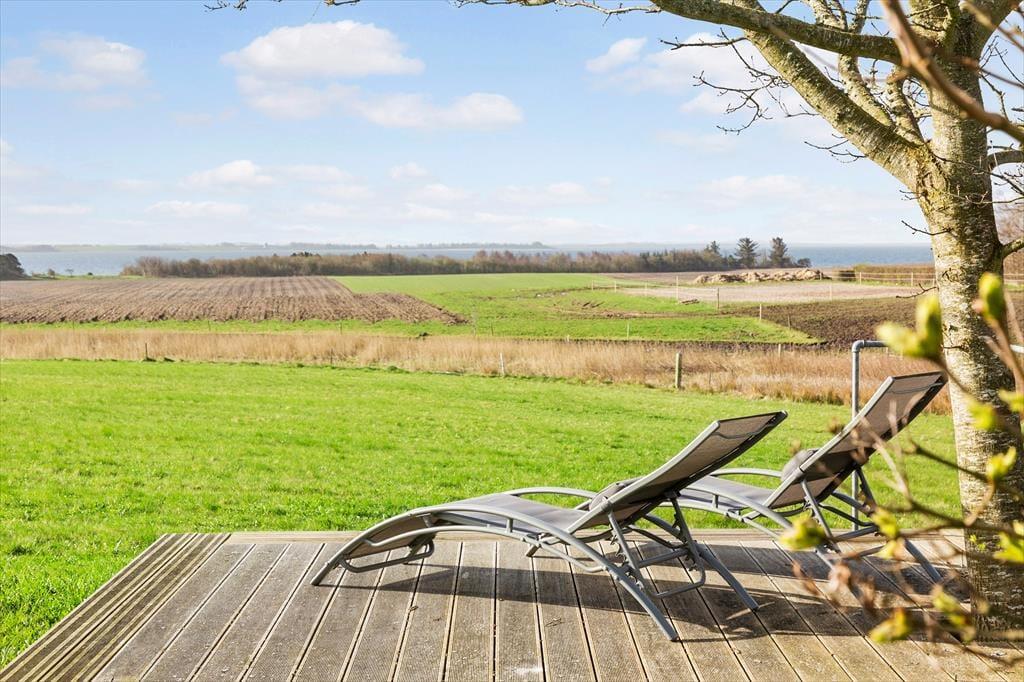 Udenfor venter et vidunderligt udendørsområde, hvor du kan nyde både den fantastiske udsigt og det rolige miljø. Den store terrasse tilbyder masser af plads til afslapning, og her kan du nyde solens stråler hele dagen. Fra terrasseområdet kan du tage en kort gåtur ned til stranden og få fingrene i det bløde sand – en perfekt mulighed for en morgendukkert eller en afslappende dag ved vandet. For de aktive er området ideelt til både gåture og cykelture, og med panoramaudsigten som baggrund kan du virkelig føle dig tættere på naturen. Når aftenen nærmer sig, kan du tænde op i grillen og nyde middag med en uforlignelig udsigt over fjorden.