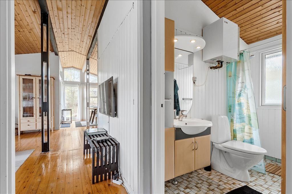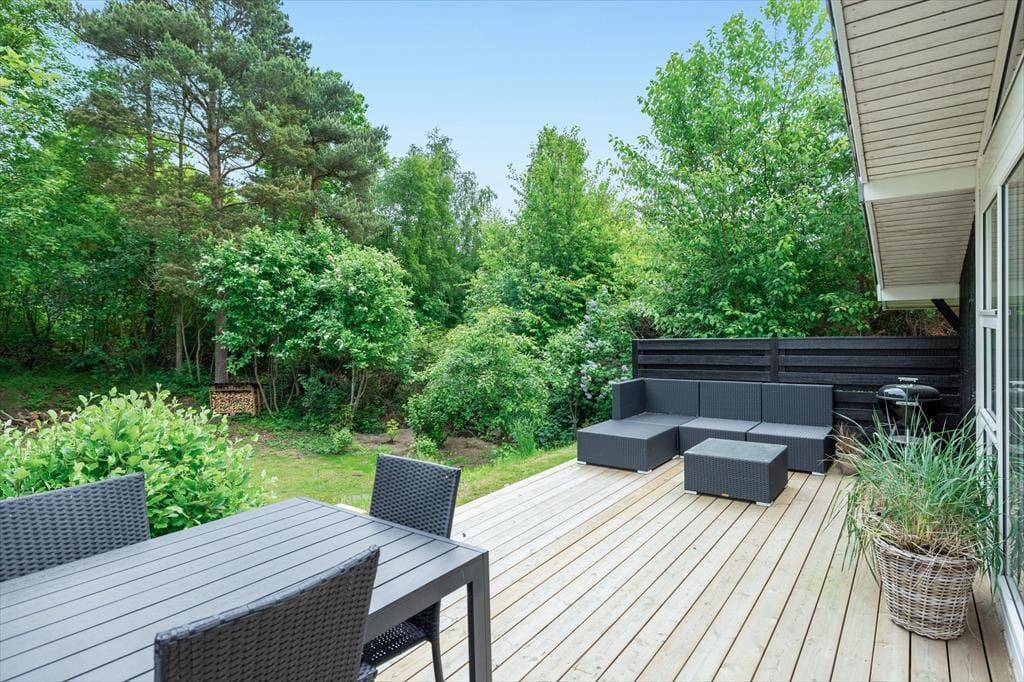 Udendørsområdet er designet til at nyde sommerdagene i fulde drag. Her finder I en dejlig terrasse, hvor morgenkaffen smager ekstra godt med fuglesang i baggrunden. Haven er oplagt til leg og afslapning, og naturen omkring inviterer til gåture og cykelture i det smukke landskab. Med kun 2,5 km til stranden kan I nemt pakke picnickurven og tilbringe dagen ved vandet.