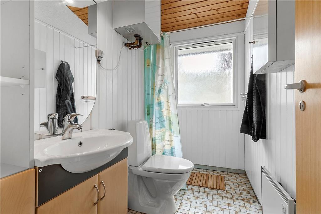Dette hyggelige feriehus byder på en varm og hjemlig atmosfære med plads til afslapning og samvær. I stuen er der en stor sofa, som indbyder til hygge med familien foran brændeovnen eller fjernsynet. Der er plads til 6 personer og et husdyr i huset, og sovepladserne fordeler sig på 3 rum med dobbeltseng. Badeværelset er med toilet og bruser. Fra både spiseområdet og køkkenet er der udgang til terrasserne.