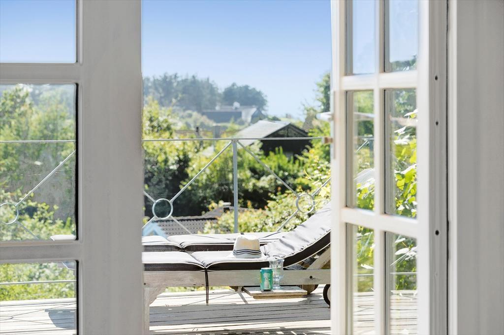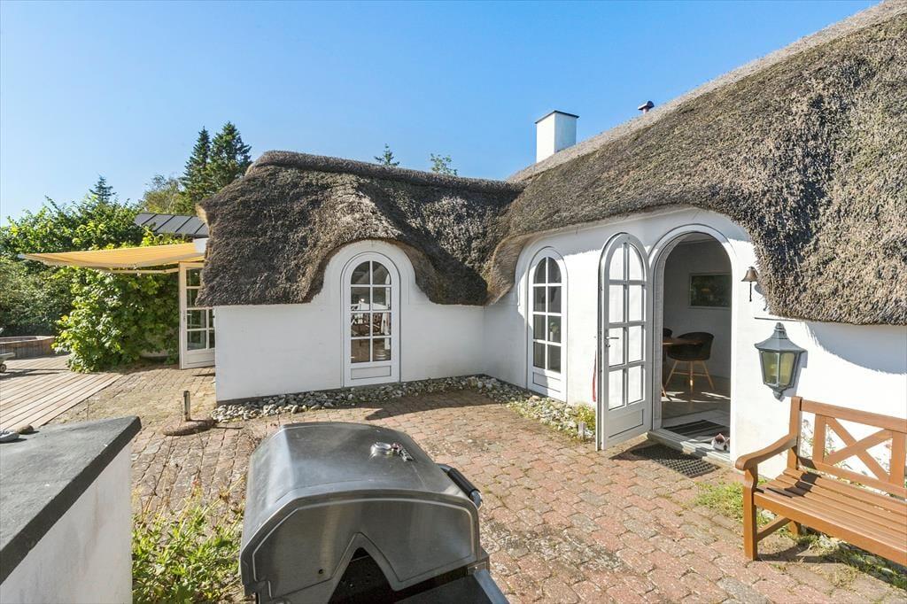 Sommerhuset er beliggende på stor ugenert grund med en fantastisk udsigt. Fra stuen er der udgang til en stor og træ terrasse med "hav kig", flere solkroge og gode havemøbler overalt. Maden kan laves på den fine gasgrill. Haven er dejlig stor og delvis ”vild med vilje”. Et stykke af haven ligger i plan, så der er også mulighed for leg og boldspil.