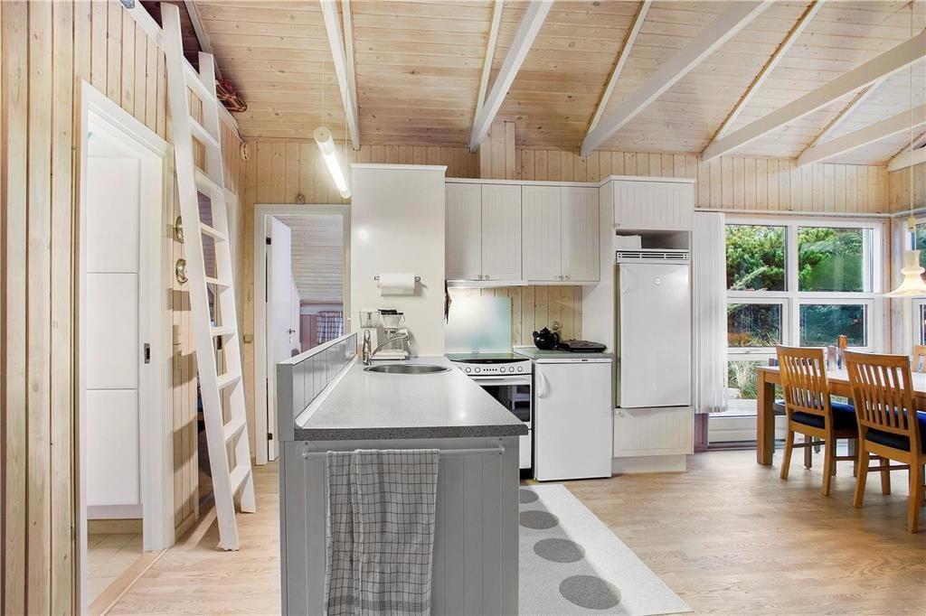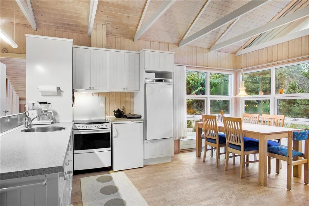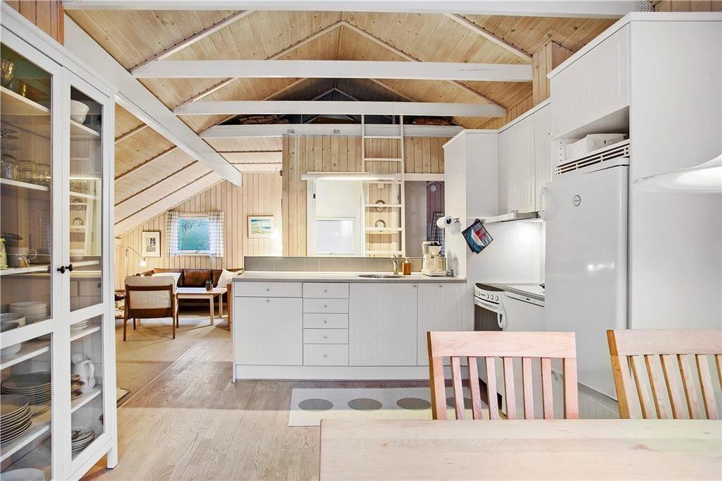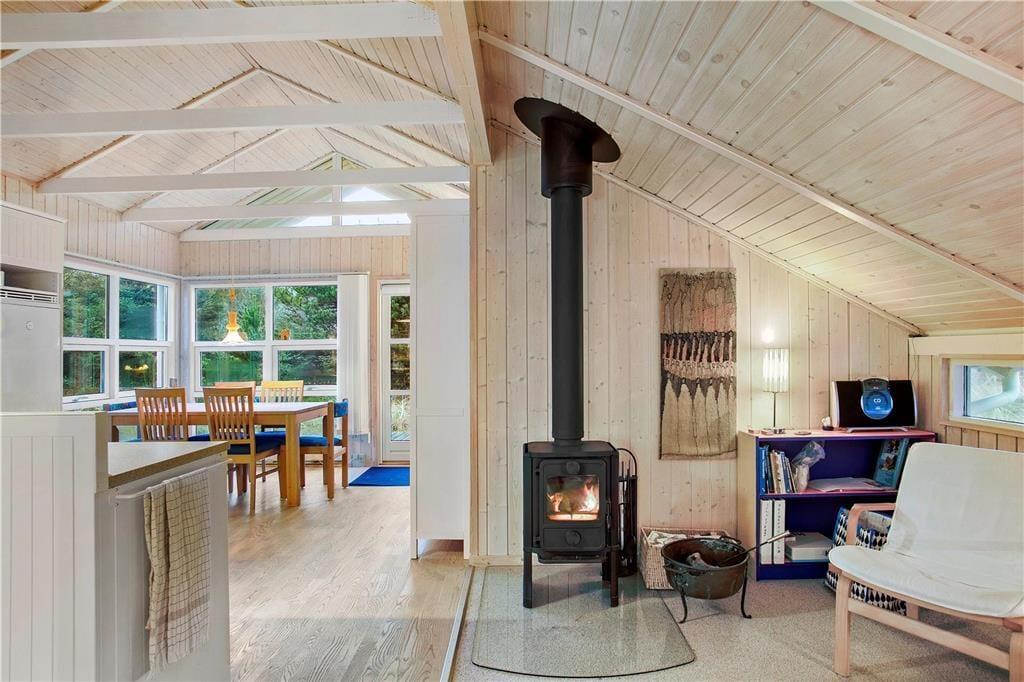 Inden døre i sommerhuset er atmosfæren lys og indbydende, og man kan tydeligt se, at rummene er blevet pænt vedligeholdt og opdateret siden opførelsen i 1982. Køkkenet er rummeligt, indeholder opvaskemaskine og ligger på velfungerende vis i åben forbindelse med både spisepladsen i den ene ende af huset og stuen i den anden. Selve stuen byder på behagelige møbler, hygge fra brændeovnen og mulighed for at streame TV fra egne abonnementer til fladskærmens tilsluttede Chromecast. Når det er ved at være sengetid, kan I lige runde badeværelset for at børste tænder, inden I går til ro på de tre gode soveværelser.