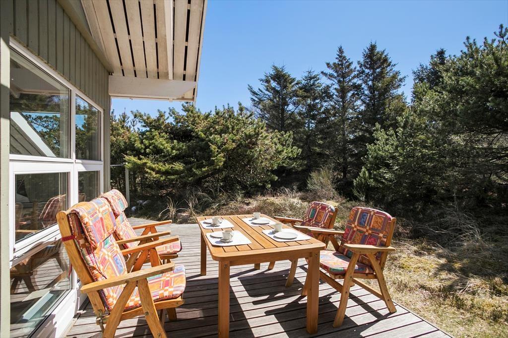 Skinner sommersolen, når I vågner op til endnu en feriedag, kan I glæde jer til at komme ud i det fri lige fra morgenstunden – og der er ligefrem en udendørs bruser på den 1254 m2 store naturgrund, så selv morgenbadet kan foregå under åben himmel. På den østvendte terrasseafdeling kan I dække op til brunch og læse avisen, og senere på dagen kan I følge med solen og rykke driverlivet hen på det store, sydvendte terrasseområde. En del af terrassen er overdækket og afskærmet, så her er der både ly og læ, hvis det skulle blive nødvendigt.