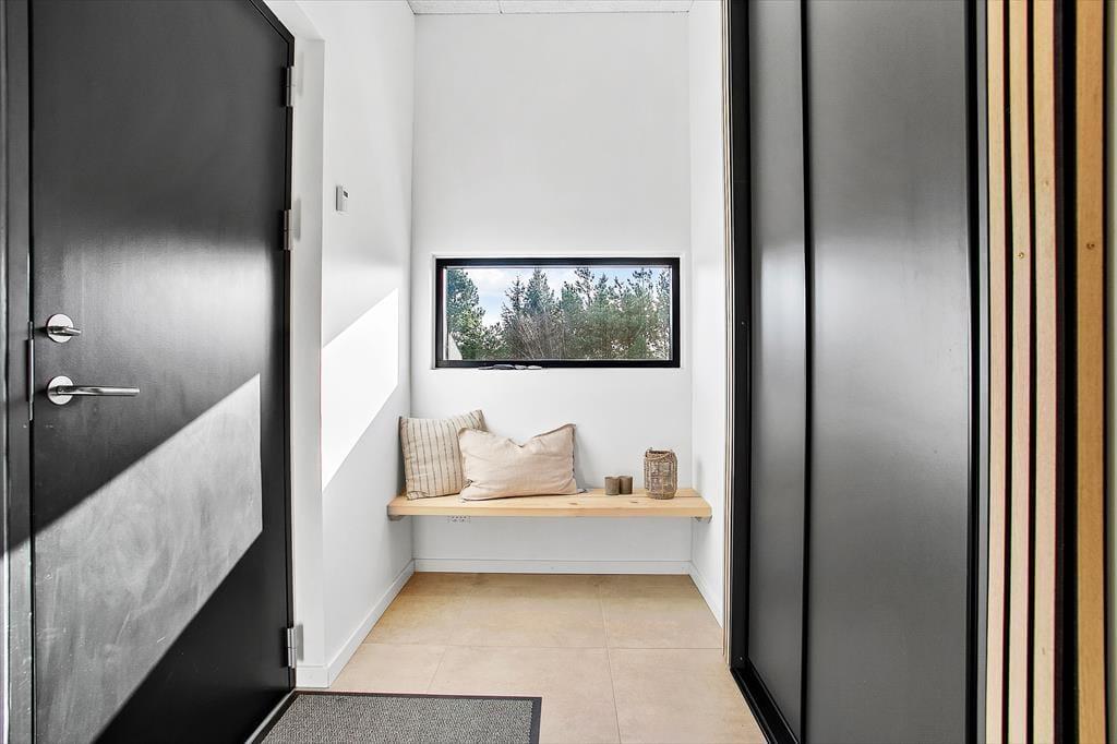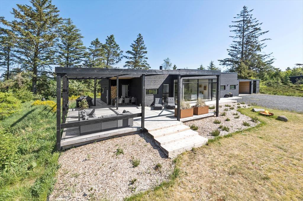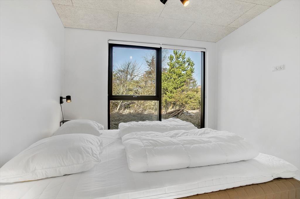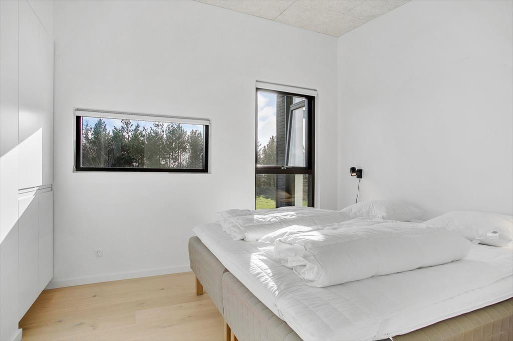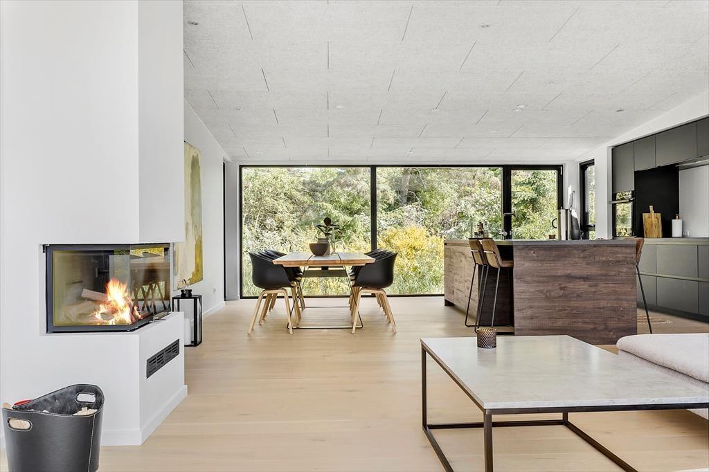 Sommerhuset er et flot byggeri fra 2021 med sortmalet træfacade og fladt tag. I forlængelse af bygningen ligger garagen, der fører jer ind til husets entré. Inden døre har rummene samme enkle elegance, og med lyse farvetoner, store vinduespartier og gulvvarme overalt er atmosfæren let og indbydende. I opholdsafdelingen er planløsningen åben, så I rigtig kan få glæde af det smukke, gennemstrømmende lysindfald, pejsens levende ild og hinandens gode selskab. Det moderne køkken er udstyret med alskens faciliteter – inklusiv en quooker, der leverer kogende vand på ingen tid – og ved sofaen hænger en stor fladskærm med kabel-tv og Chromecast. På det største af husets to badeværelser står et badekar, og på alle fire soveværelser fortsætter den minimalistiske og lækre indretningsstil.