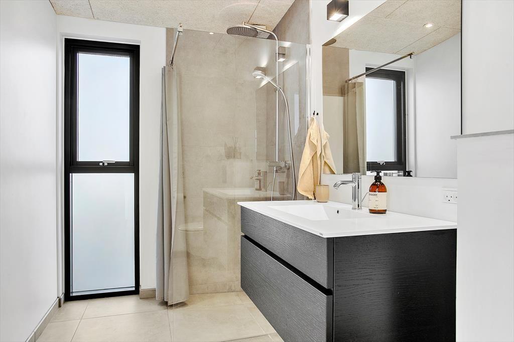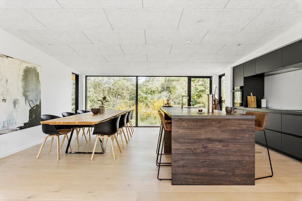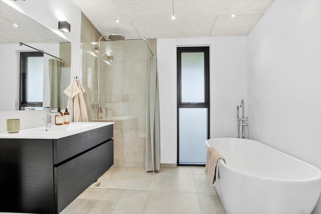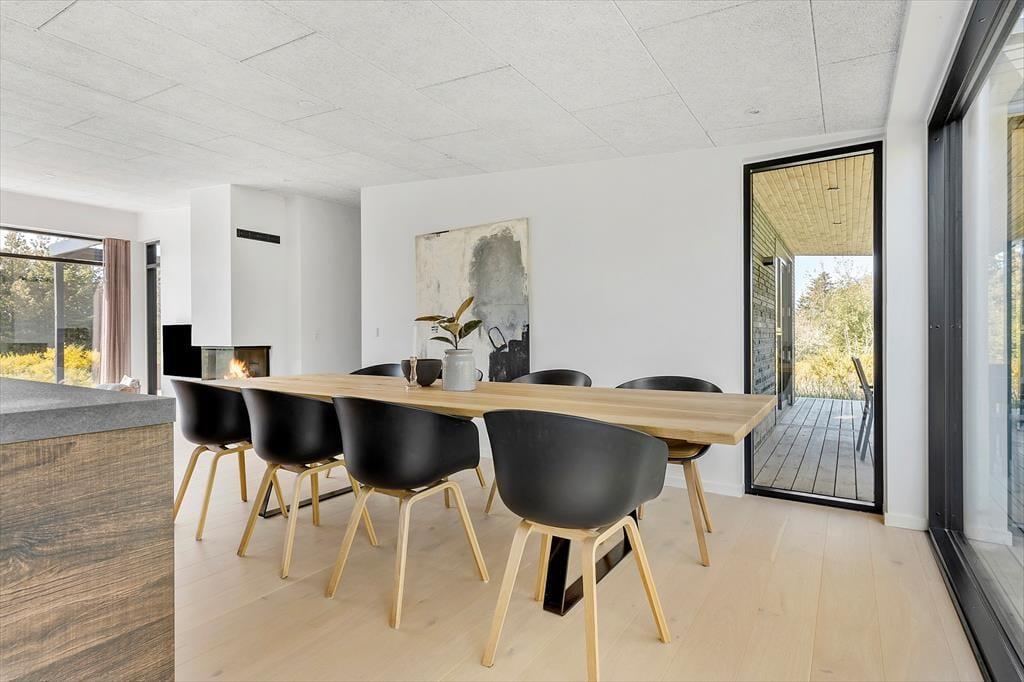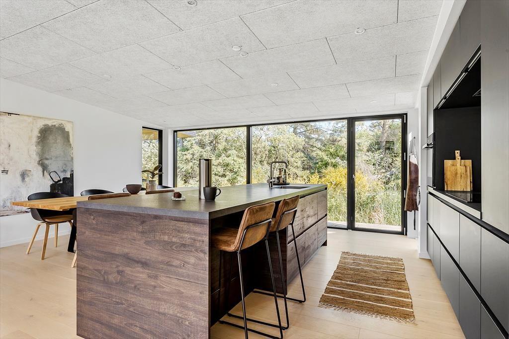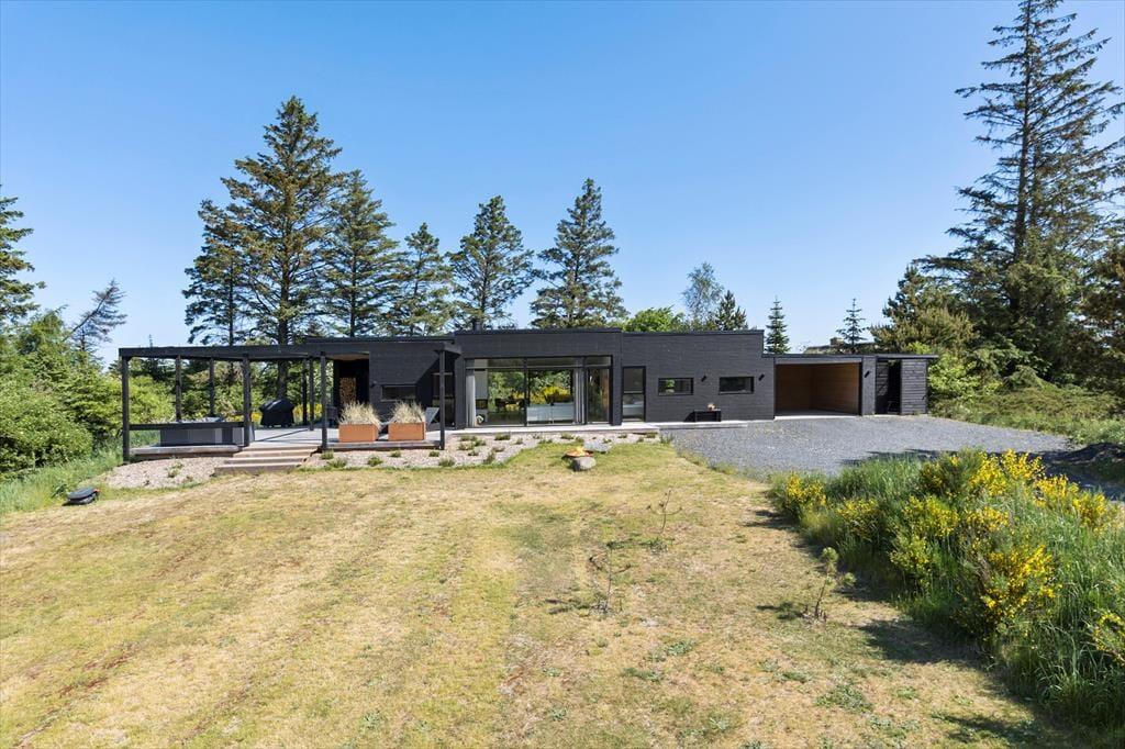 Sommerhuset er et flot byggeri fra 2021 med sortmalet træfacade og fladt tag. I forlængelse af bygningen ligger garagen, der fører jer ind til husets entré. Inden døre har rummene samme enkle elegance, og med lyse farvetoner, store vinduespartier og gulvvarme overalt er atmosfæren let og indbydende. I opholdsafdelingen er planløsningen åben, så I rigtig kan få glæde af det smukke, gennemstrømmende lysindfald, pejsens levende ild og hinandens gode selskab. Det moderne køkken er udstyret med alskens faciliteter – inklusiv en quooker, der leverer kogende vand på ingen tid – og ved sofaen hænger en stor fladskærm med kabel-tv og Chromecast. På det største af husets to badeværelser står et badekar, og på alle fire soveværelser fortsætter den minimalistiske og lækre indretningsstil.