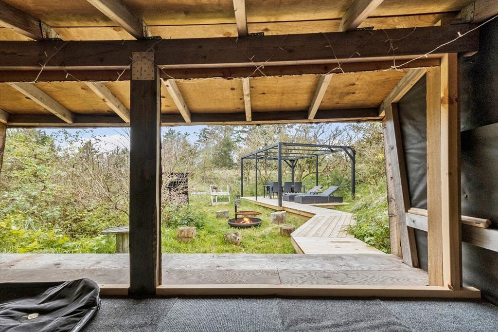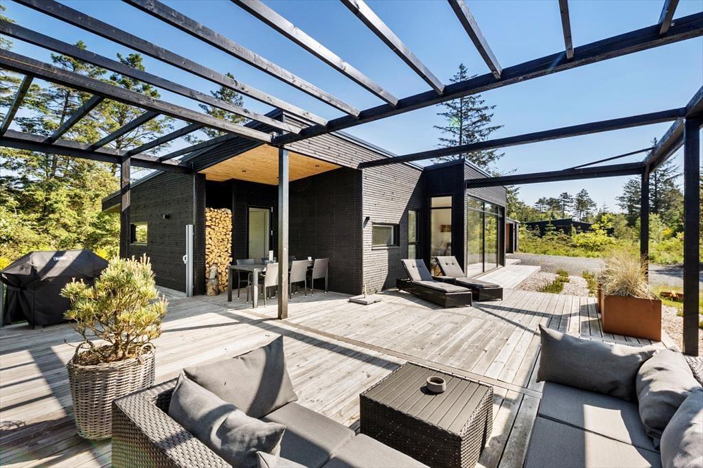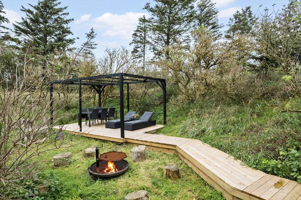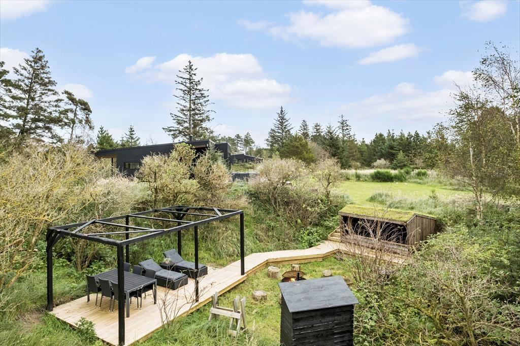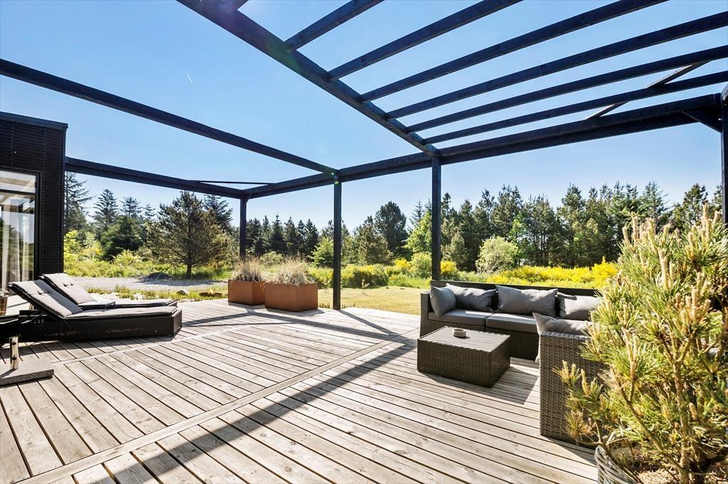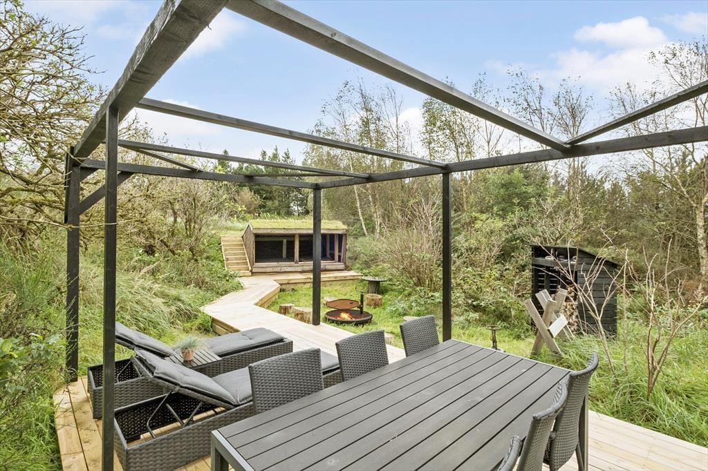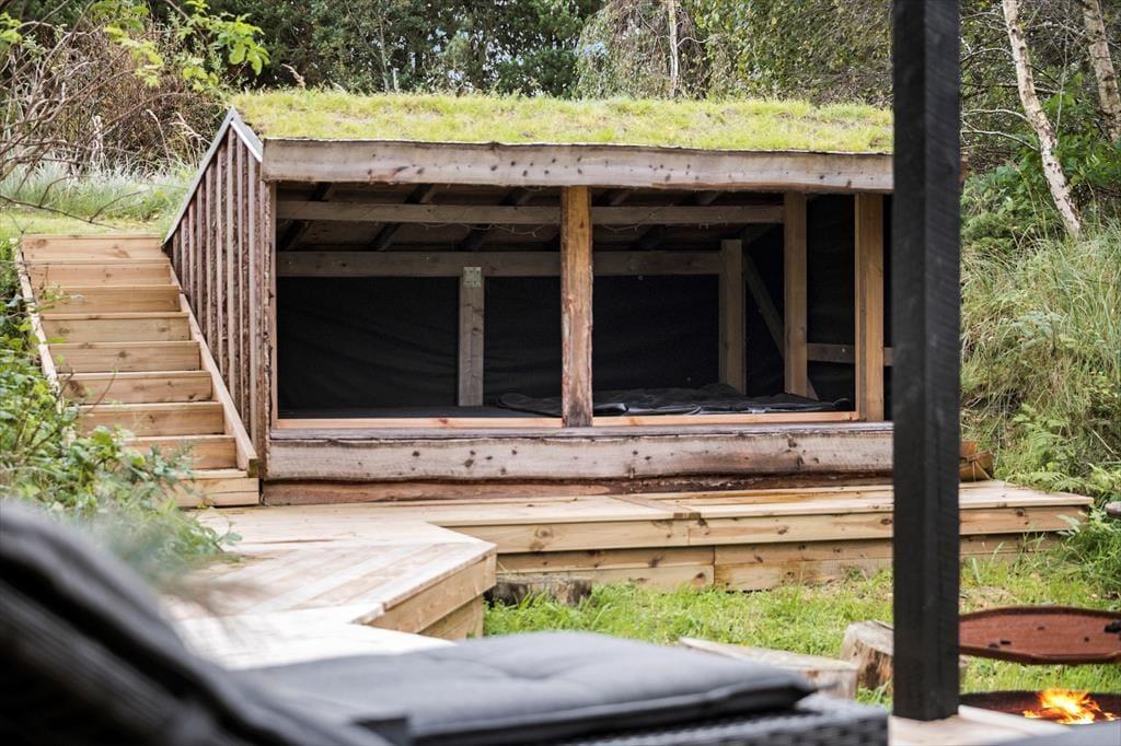 Et kæmpe terrassemiljø omkranser hele sommerhuset, så I kan sætte jer lige der, hvor solforholdene er bedst. Størstedelen af træterrassen er åben, men der er også overdækkede områder, hvor I for eksempel kan sidde efter aftensmaden, mens himlen langsomt mørkner, og naturgrundens fugle synger deres aftensang. I foråret 2022 er der udvidet med yderligere terrasse og pergola i shelterområdet, hvor maden også kan nydes tillige med bålhygge og solbadning.