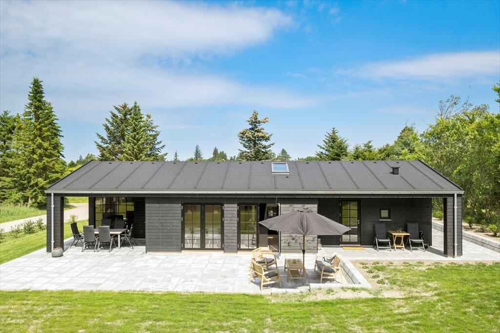 Udenfor finder du en stor og indbydende fliseterrasse, der både har en åben og en overdækket del. Her kan du nyde solen fra morgen til aften eller søge skygge, når du har brug for det. Terrassen er udstyret med gode havemøbler, liggestole og en parasol, så du kan slappe af i komfortable omgivelser. For børnene er der masser af plads til at lege og udforske naturen omkring sommerhuset og med kun en kort gåtur til stranden, kan du nemt tilbringe dagene med at bade og nyde den friske havluft.