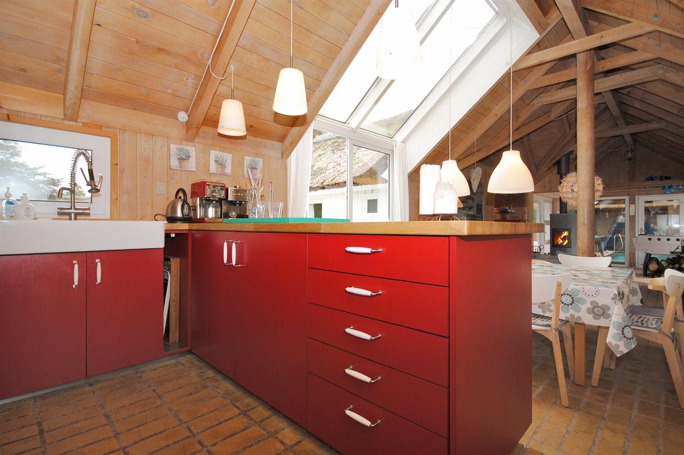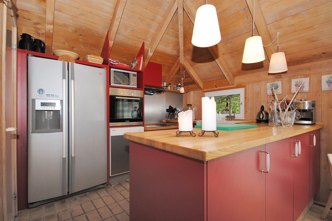 Køkkenet er udstyret med 1 amerikansk køleskab. Der er 4 keramiske kogeplader, varmluftovn, mikrobølgeovn samt opvaskemaskine.