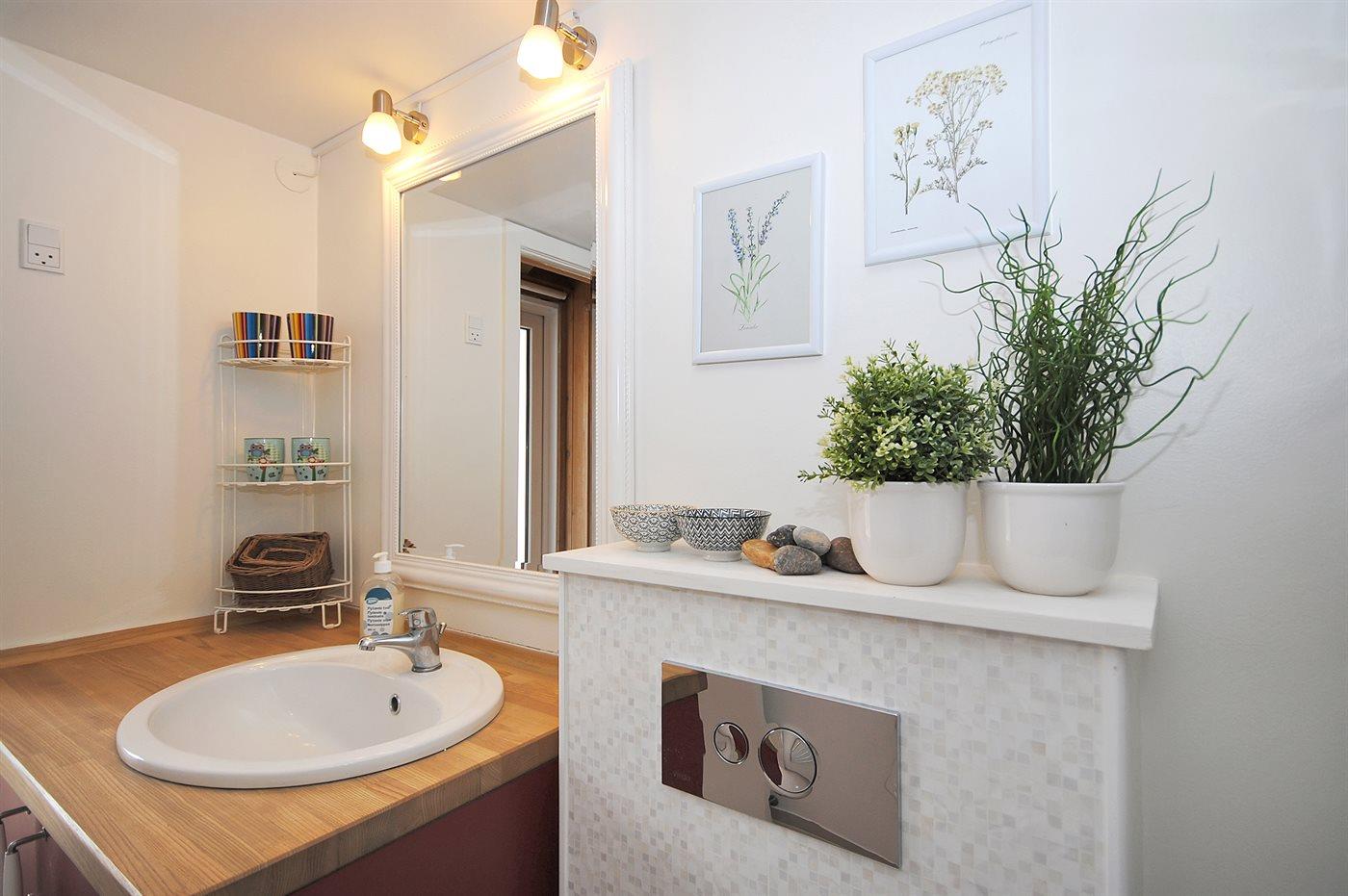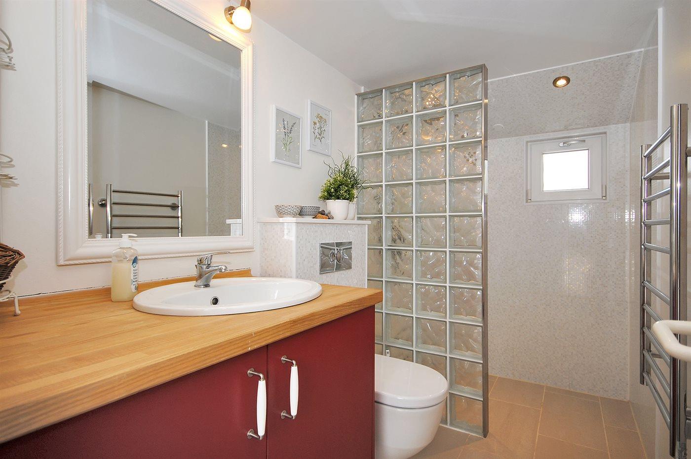 Der er 2 badeværelser med bruseniche og 2 toiletter I saunaen er der mulighed for afslapning.
