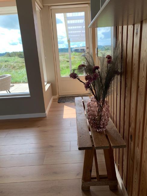 Die schöne Terrasse ist mit Flisen belegt und mit guten Gartenmöbeln und ein Gasgrill ausgestatt.