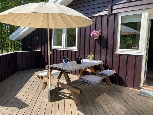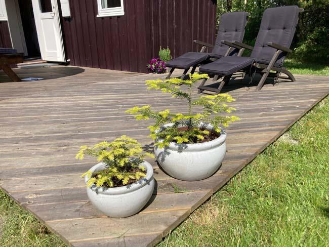 Huset ligger på en plænegrund, som er omgivet træer. Her kan man på græsplænen eller på en af de to terrasser nyde fuglesang og høj solskin på en dejlig varm sommerdag. Den ene terrasse er i forbindelse med fordøren, og den anden er på modsatte side af huset, også med dør ind i huset.