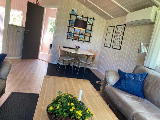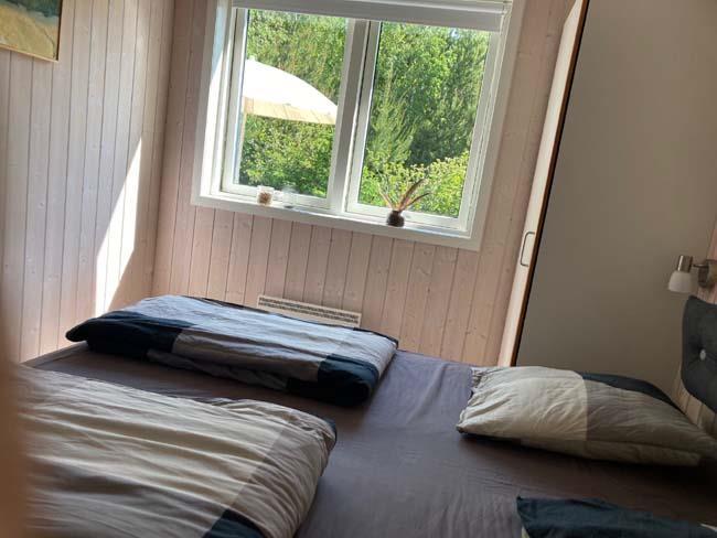 Når man træder ind i huset mødes man af et stort og lyst rum, som går op i kip. Hele husets indre er beklædt med lyst træ og store vinduer, hvilket gør huset rigtig lækkert og roligt at befinde sig i. Huset har tre soveværelser, et med en enkeltseng og de to andre med dobbeltseng. Derudover har huset et stort badeværelse, som både har brusebad, spabad og sauna. Hvilken luksus det er, at komme tilbage til huset efter en dag fyldt med aktiviteter, og så at slappe af med noget godt musik og velvære.