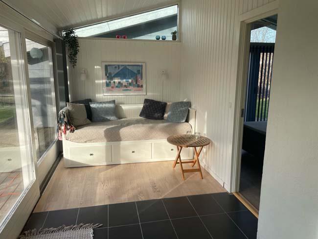 Træder man et lille trin op, møder man det næste hyggested, med bl.a. en dejlig dobb. daybed. Dette er hjørnet for hygge med bøger eller brætspil. Her er der også en stor skydedør ud til den største del af terrassen, som er overdækket. Herude kan familien passende gå direkte fra at have forberedt maden inde i køkkenet og ud på terrassen og grille det. Udover dette skønne køkken alrum, har huset et badeværelse og tre soveværelser. Det ene har en dobbeltseng, det andet har en enkeltseng og det sidste har en køjeseng.