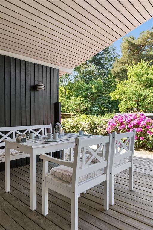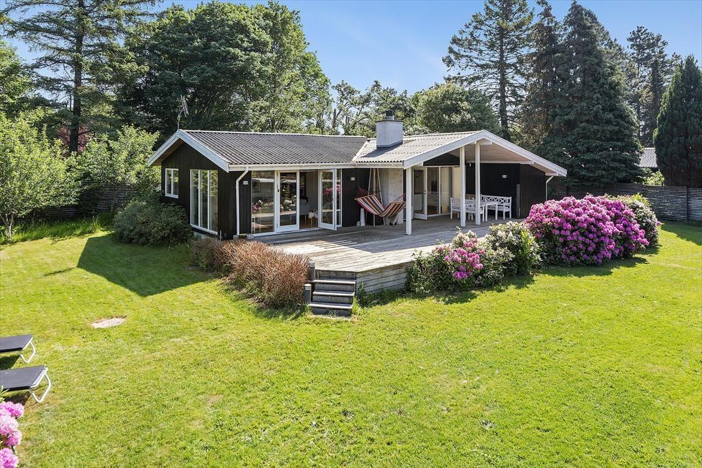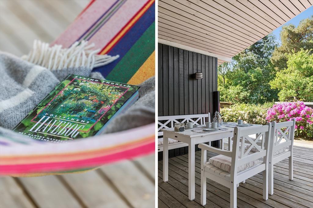 Sommerhuset er omgivet af en stor indhegnet have, der er ideel til boldspil og leg. Den hævede terrasse, som både er åben og overdækket, giver rig mulighed for at nyde udelivet uanset vejret. Spis en dejlig middag udendørs på terrassens spiseplads, eller slap af i hængekøjen med en god bog.