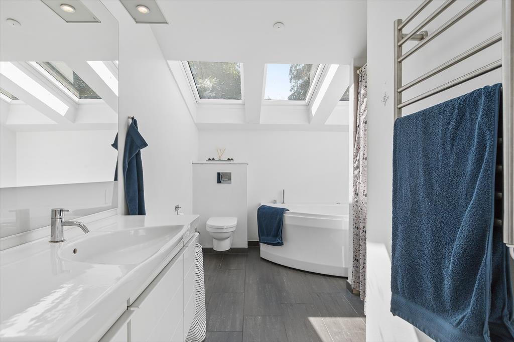 Der er et dejligt badeværelse med spa, hvor du kan forkæle dig selv med et varmt bad, samt et praktisk gæstetoilet.