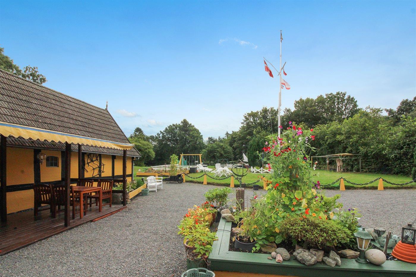 På den store fælles grund findes der en lille dam med de fineste åkander, en legeplads med blandt andet sandkasse, gyngestativ, rutsjebane og legetårn, en petanquebane, fodboldmål samt udendørs badmintonbane - et rigtigt eldorado for børn og barnlige sjæle. Man kan trygt følge børnenes leg på det store legeareal i skyggen fra den overdækkede terrasse ud mod gårdspladsen. På den anden side af lejligheden er endnu en delvis overdækket terrasse med udsigt over marker og solnedgangen.