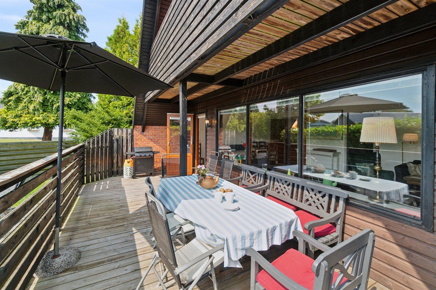 Den lyse opholdsstue med udgang til den overdækkede terrasse er et naturligt samlingssted, og den sydvendte terrasse er ideel til en hyggelig grillaften for hele familien.