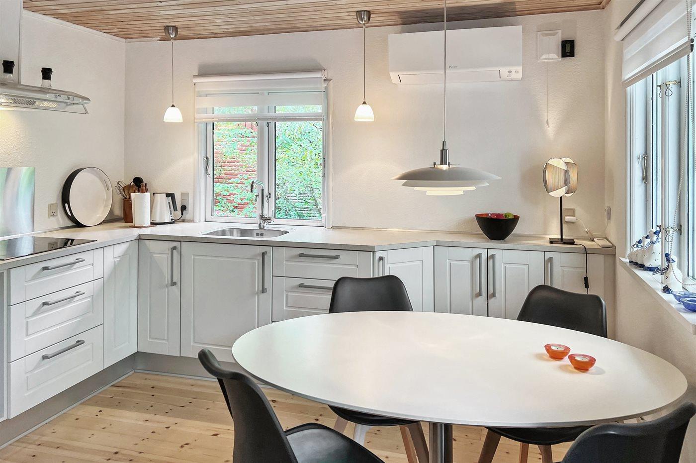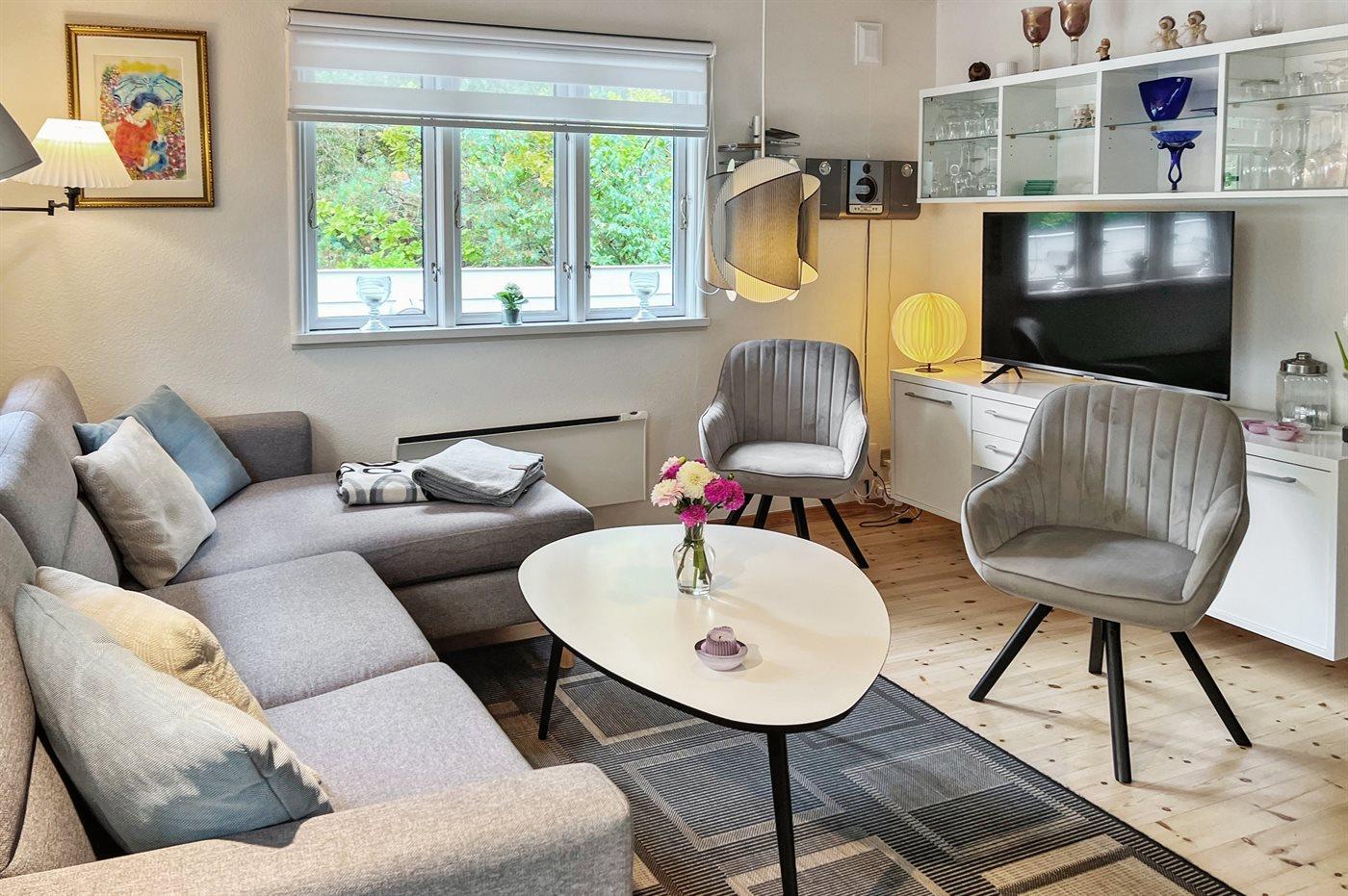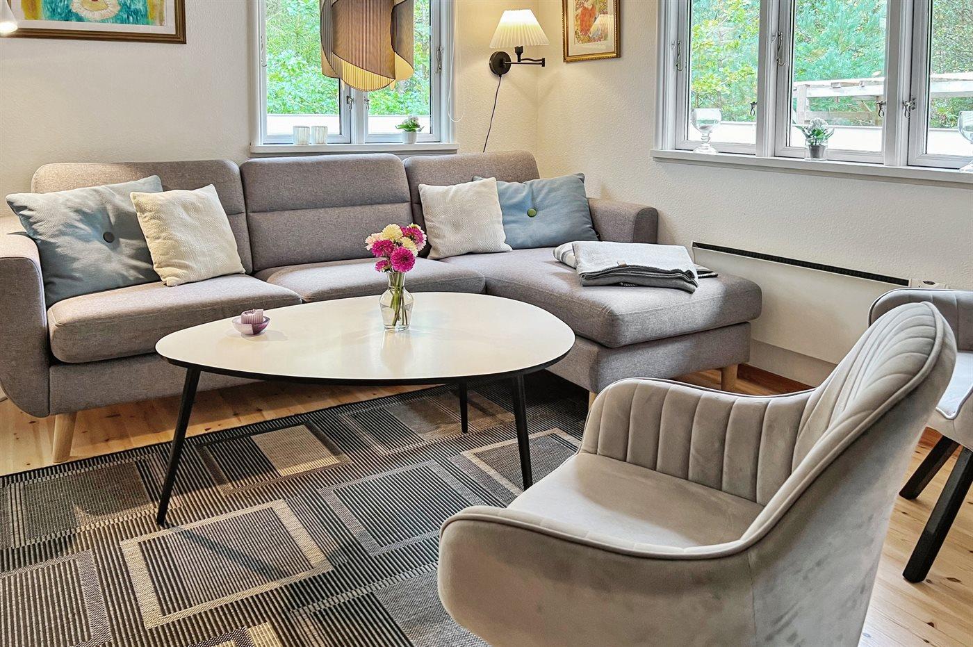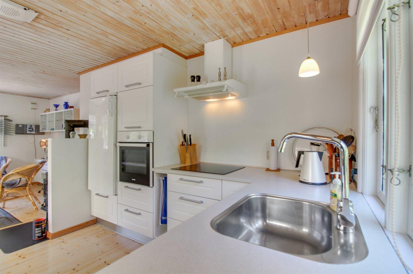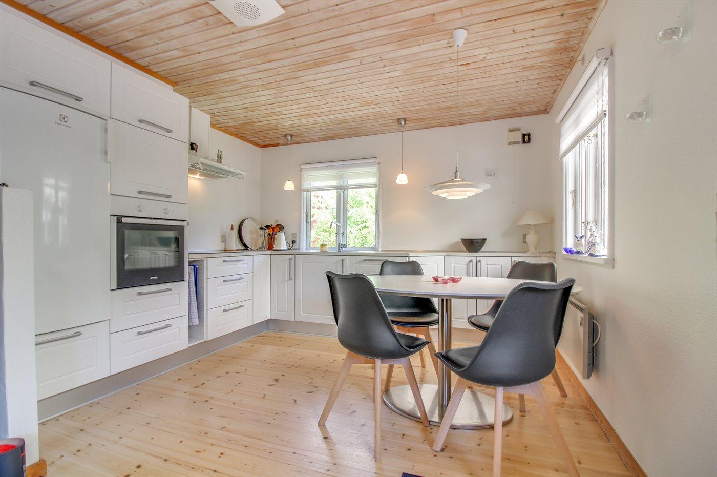 Husets dejlige køkken med spiseplads er bl.a. udstyret med lille fryser, varmluftovn og komfur med keramiske kogeplader. I den hyggelige og pænt møblerede opholdsstue, hvorfra der er udgang til den overdækkede terrasse, finder I brændeovn, DVD-afspiller, TV og stereoanlæg med CD-afspiller. Der er installeret trådløs internetforbindelse (50/50 Mbit).