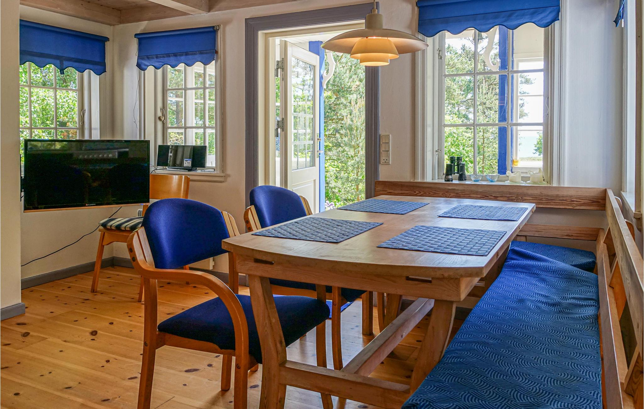 Glæd jer til dette herlige sommerhus, som præsenterer sig utroligt charmerende med sin sommerblå farve, gammeldags sprossede vinduer og en hyggelig veranda, hvor I kan nyde morgenkaffen. Her får I nogle skønne feriedage, uanset om sæsonen er til indendørshygge eller sol i haven. I opholdsstuen kan I tænde op i den fine brændeovn på kølige dage og give jer god tid til madlavningen i køkkenet, mens børnene slapper af i stuen. Foruden to gode soveværelser er der en hems til to personer, så der er plads til seks overnattende gæster.
