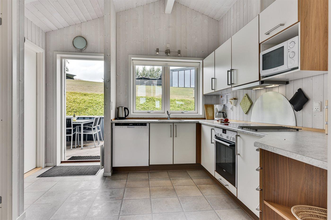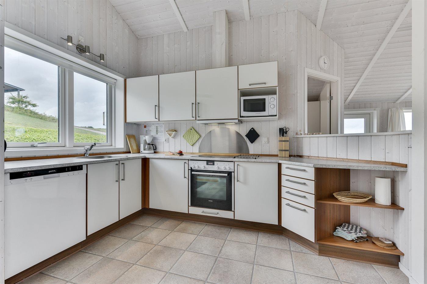 Køkkenet er udstyret med 1 køleskab. Der er 4 keramiske kogeplader, varmluftovn, mikrobølgeovn samt opvaskemaskine.