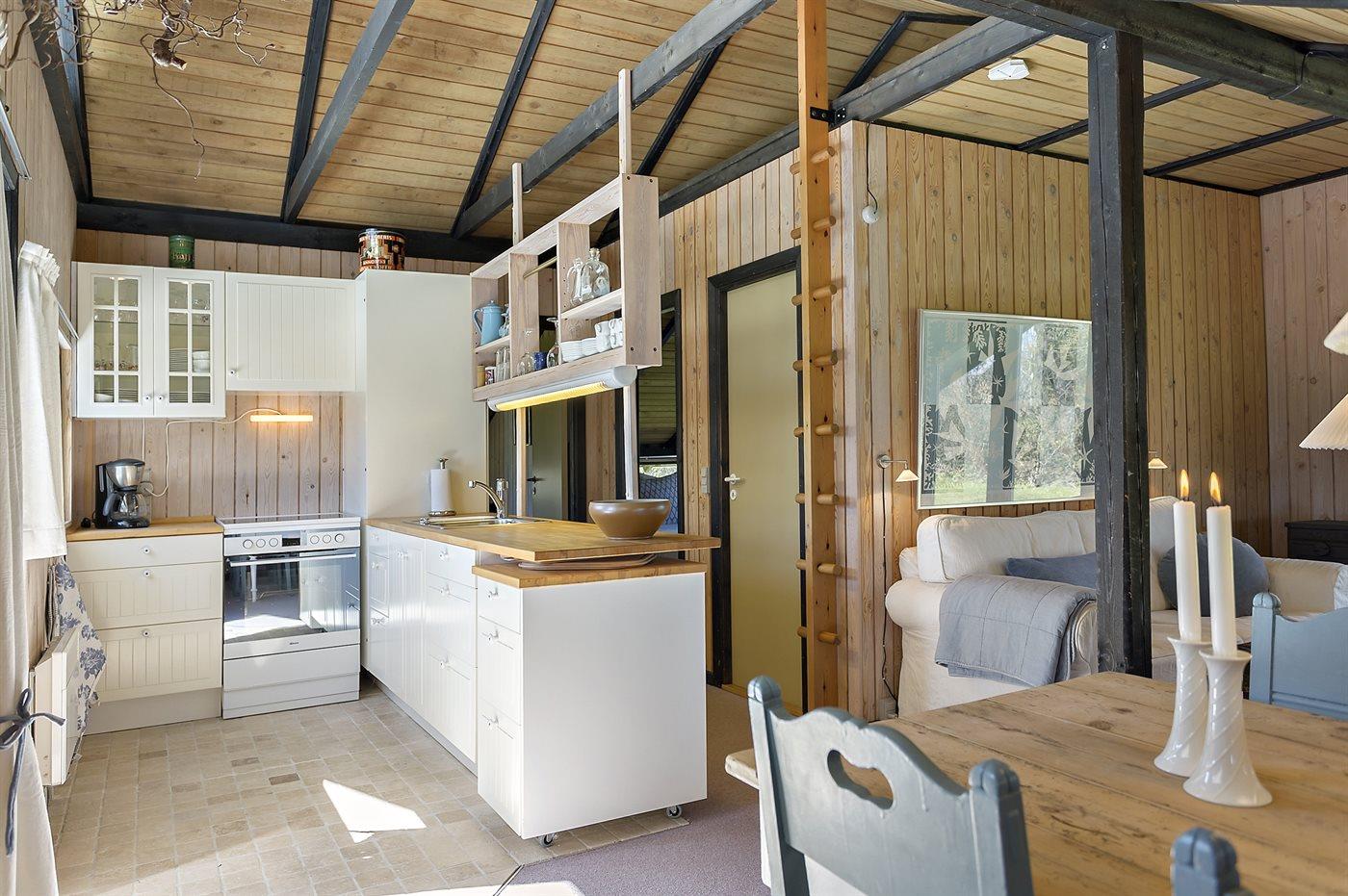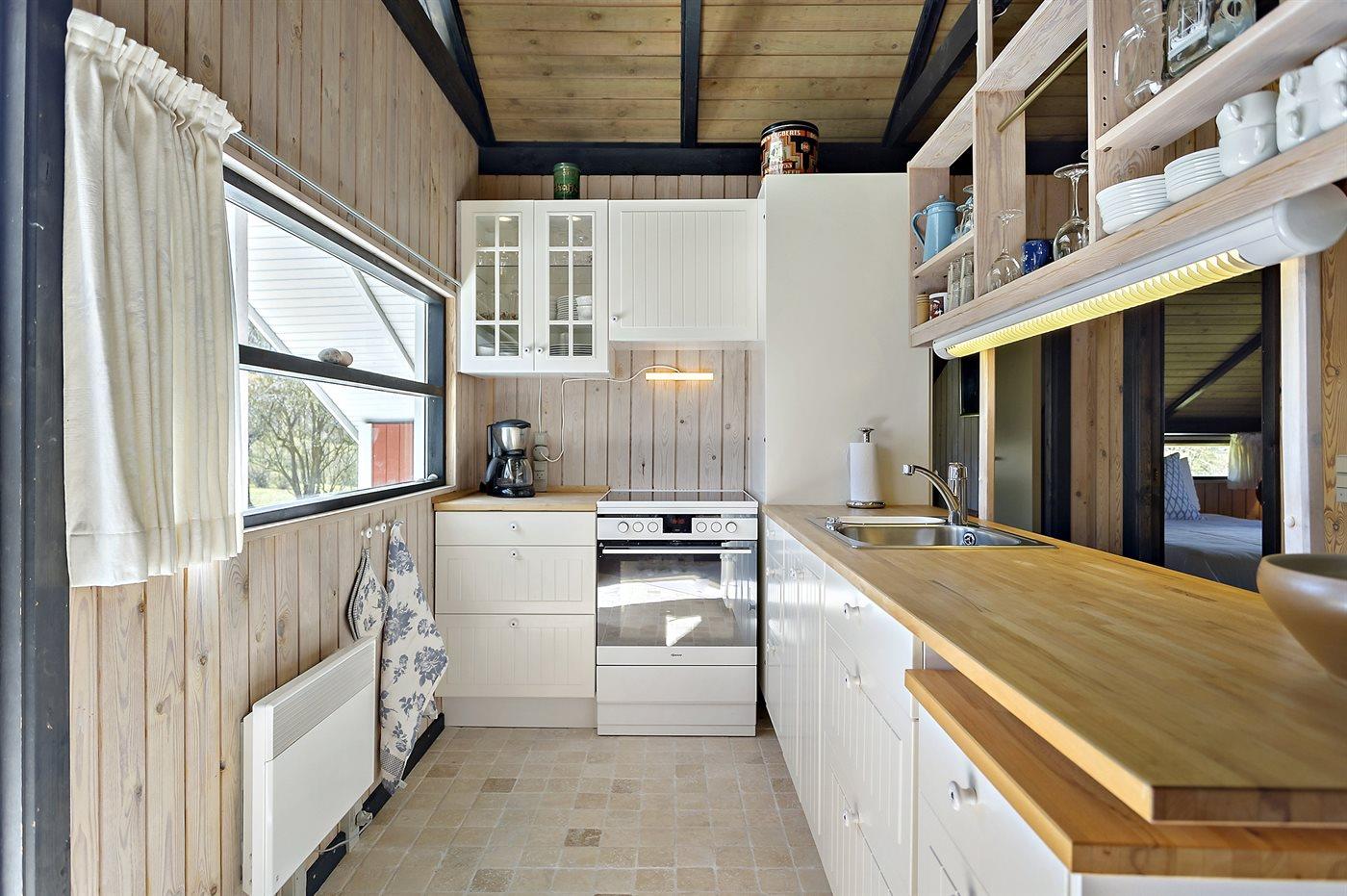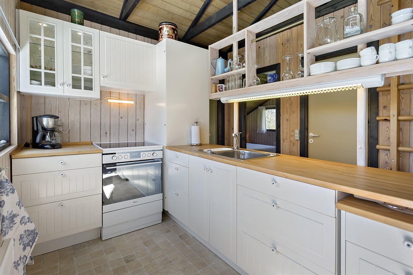 Køkkenet er udstyret med 1 køleskab. Der er 4 keramiske kogeplader, varmluftovn, mikrobølgeovn samt opvaskemaskine.