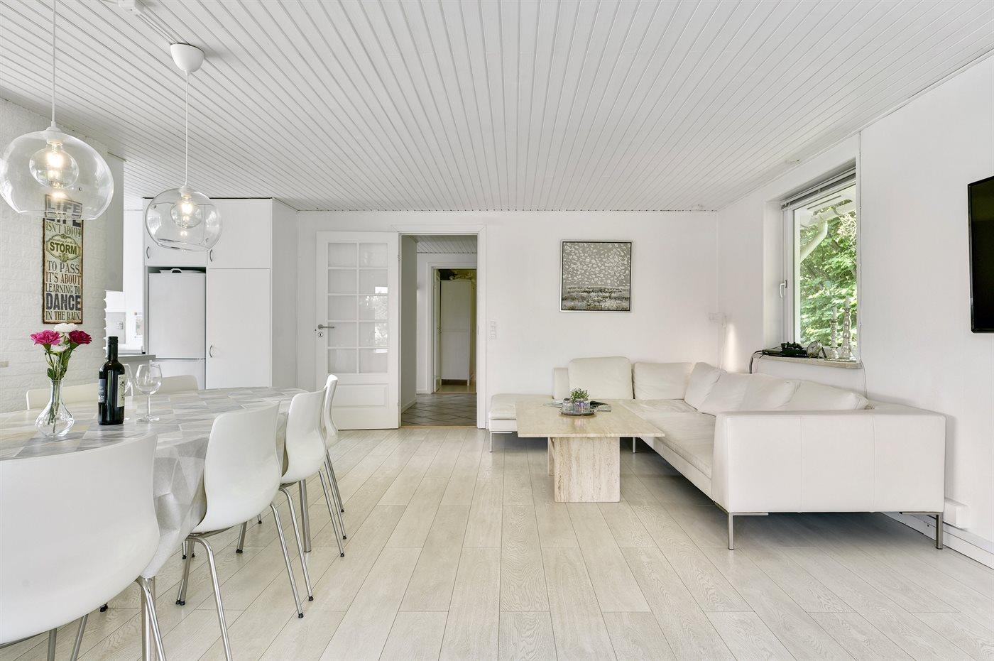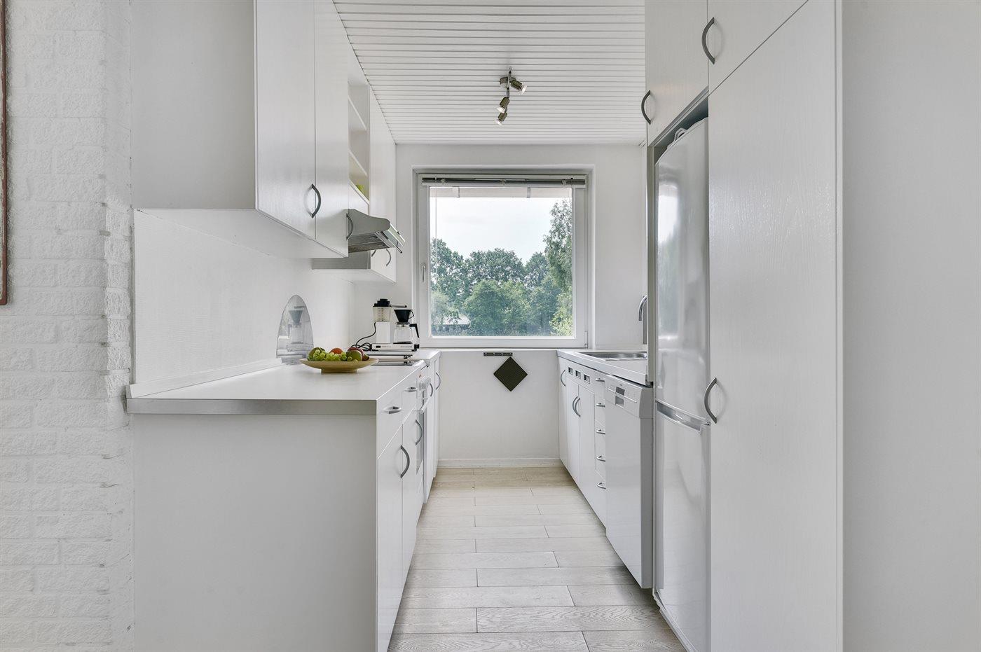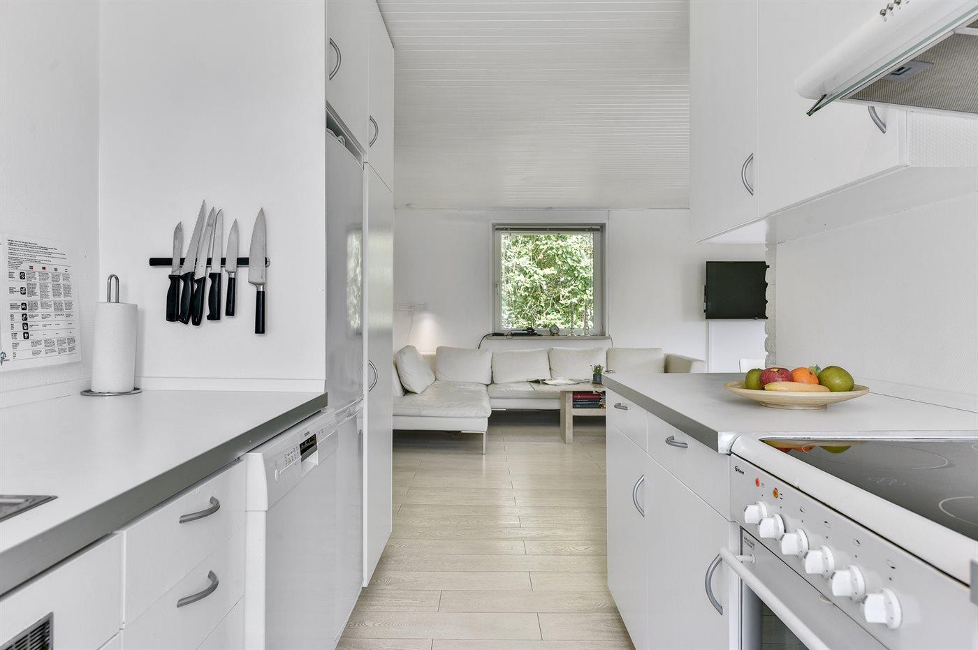 Køkkenet er udstyret med 1 køleskab. Der er 4 keramiske kogeplader, varmluftovn, mikrobølgeovn samt opvaskemaskine.