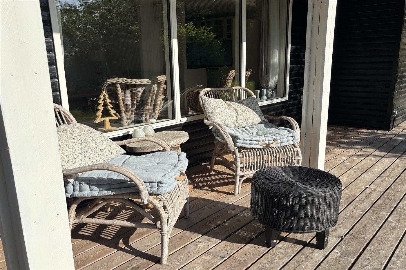 Ferieboligen er beliggende på en 1287 m² stor havegrund. Der er 400 m til havet. Der er en sø i en afstand af 20 m. Nærmeste forretning er beliggende i en afstand af 1500 m. Til ferieboligen hører 90 m² terrasseareal. Desuden er der 45 m² overdækket terrasse. Bålsted. Gasgrill står til rådighed. Parkering ved ferieboligen.