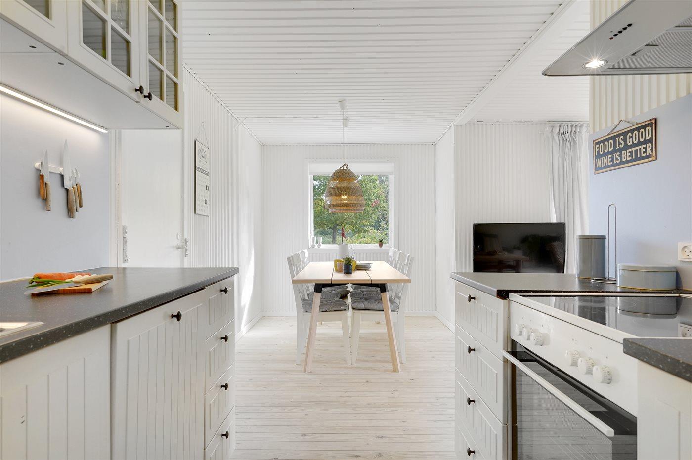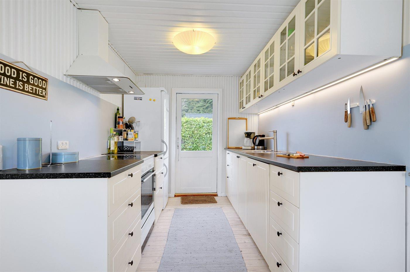 Køkkenet er udstyret med 1 køleskab. Der er 4 keramiske kogeplader, varmluftovn, mikrobølgeovn samt opvaskemaskine.