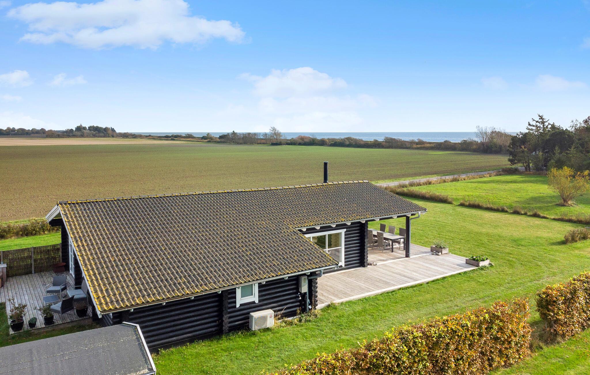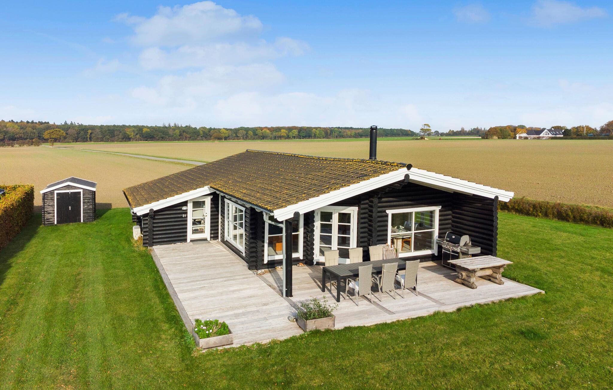 Hyggeligt bjælkehus nær havet på Lolland med terrasse, pejs og aktivitetsrum til afslapning og leg.