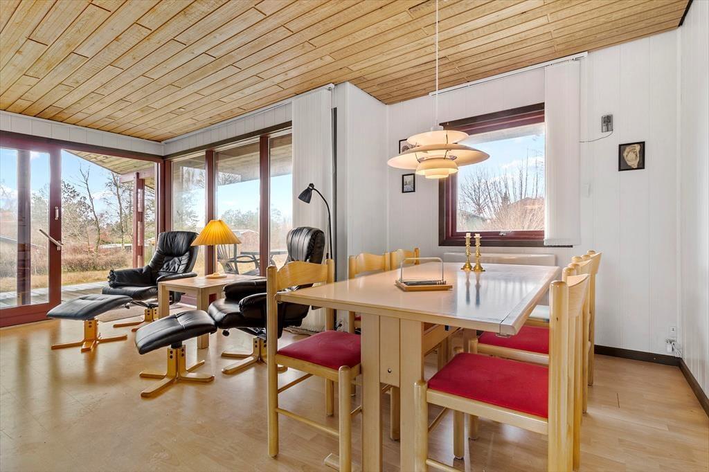 Træd ind i et sandt 70’er-nostalgisk sommerhus, hvor atmosfæren fra 1978 stadig lever! Her finder du en hyggelig stue med både brændeovn og varmepumpe, så komforten er helt i top. Fra stuen går du ud på en dejlig træterrasse, hvor du kan dufte Helgenæs’ friske luft og nyde udsigten til den åbne grund. Stuen er i åben forbindelse med et spiseområde og køkken, og herfra kan du åbne stalddøren og træde ud på en fliseterrasse. Huset byder på tre soveværelser – et med dobbeltseng og to med sovesofaer – samt et badeværelse, så der er plads til hele familien.