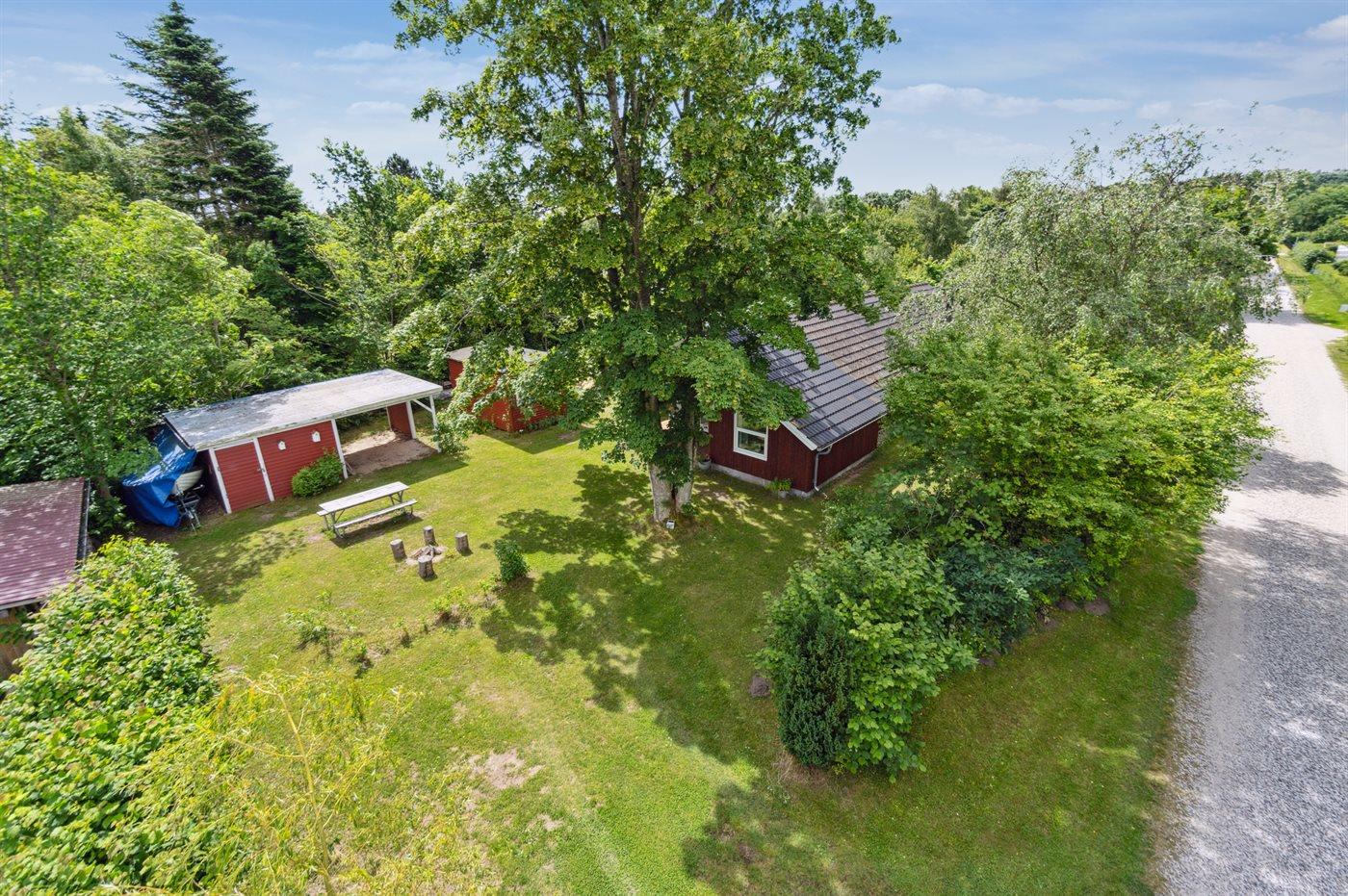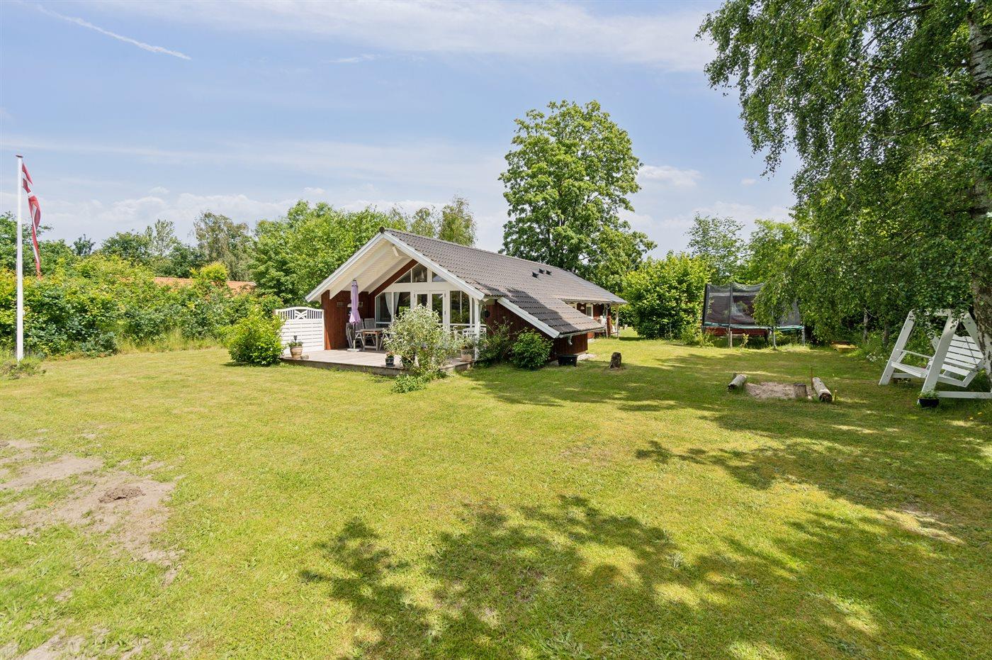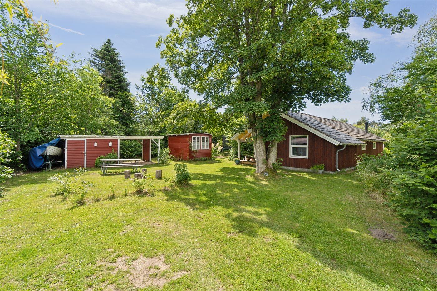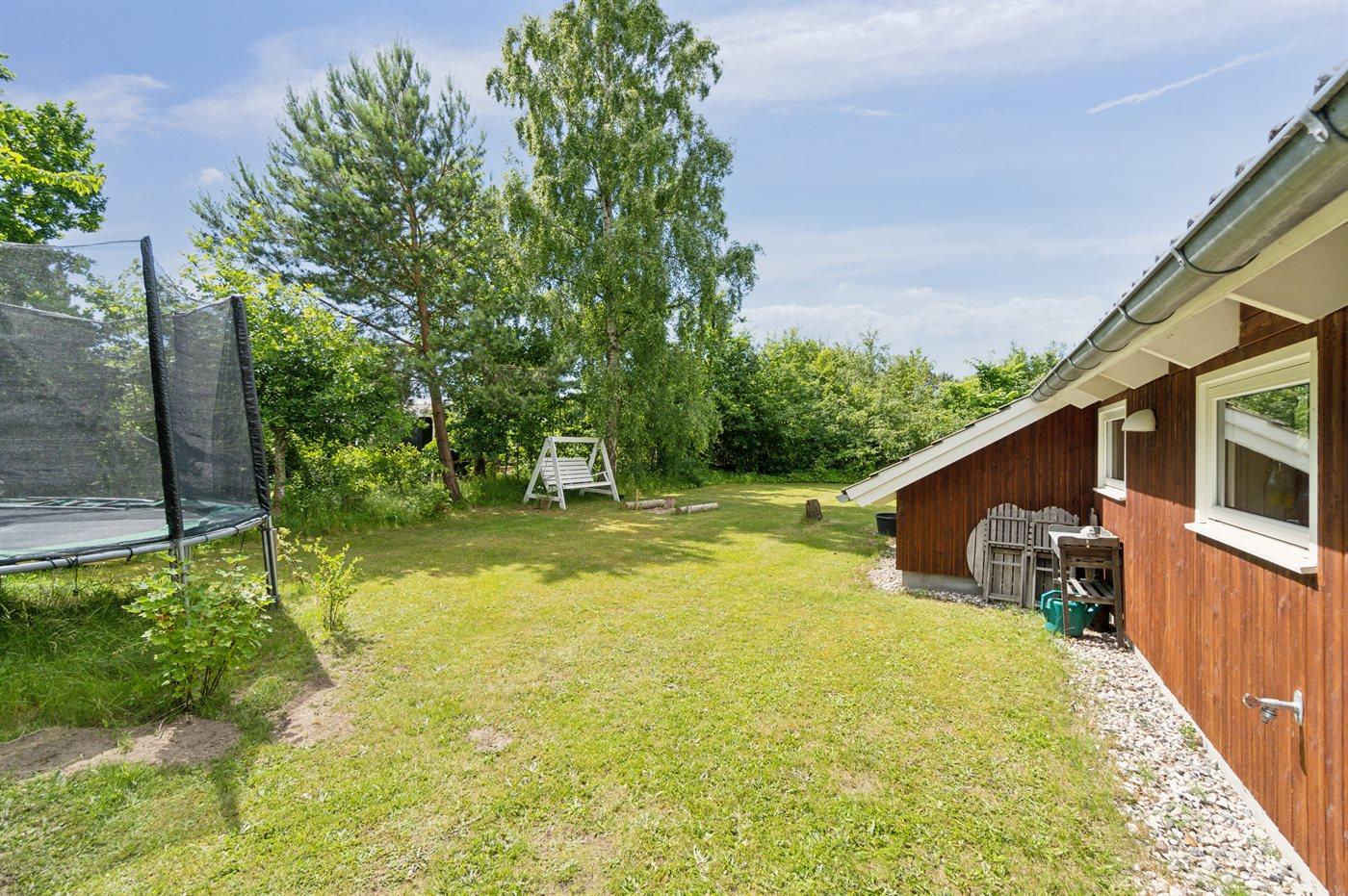 Ferieboligen er beliggende på en 1216 m² stor havegrund. Grunden er indhegnet. Der er 450 m til havet. Nærmeste forretning er beliggende i en afstand af 5000 m. Til ferieboligen hører åbent terrasseareal. Desuden er der overdækket terrasse. Gynge. Sandkasse. Trampolin. Bålsted. Weber gasgrill til rådighed. Parkering ved ferieboligen.