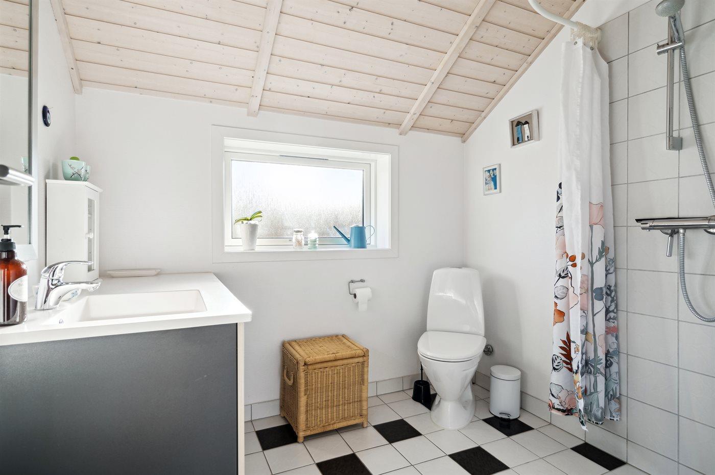 Der er 1 badeværelse med bruser og 2 toiletter, heraf 1 gæstetoilet. Der er gulvvarme på 1 badeværelse. Der er gulvvarme på gæstetoilettet.