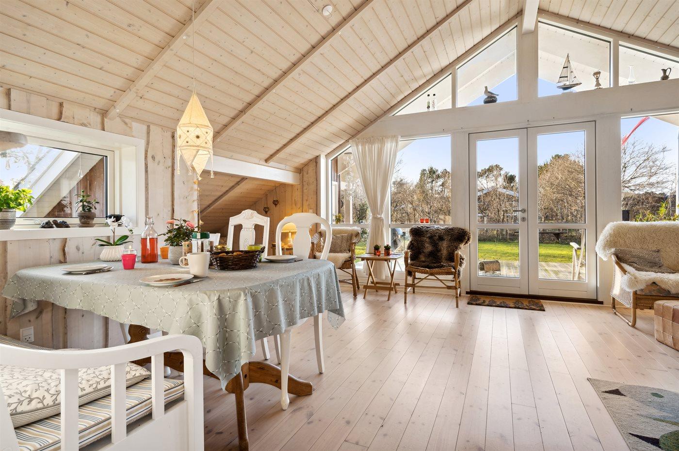 Indvendig fremstår sommerhuset lyst og indbydende. Husets hjerte er det store og lyse køkken/alrum og stue i ét med masser af lysindfald og med direkte adgang til den skønne terrasse. Sommerhuset er godt indrettet, og her er god plads til f.eks. en børnefamilie, som ønsker at tage bedsteforældre med på ferie - mulighederne er mange i dette sommerhus.