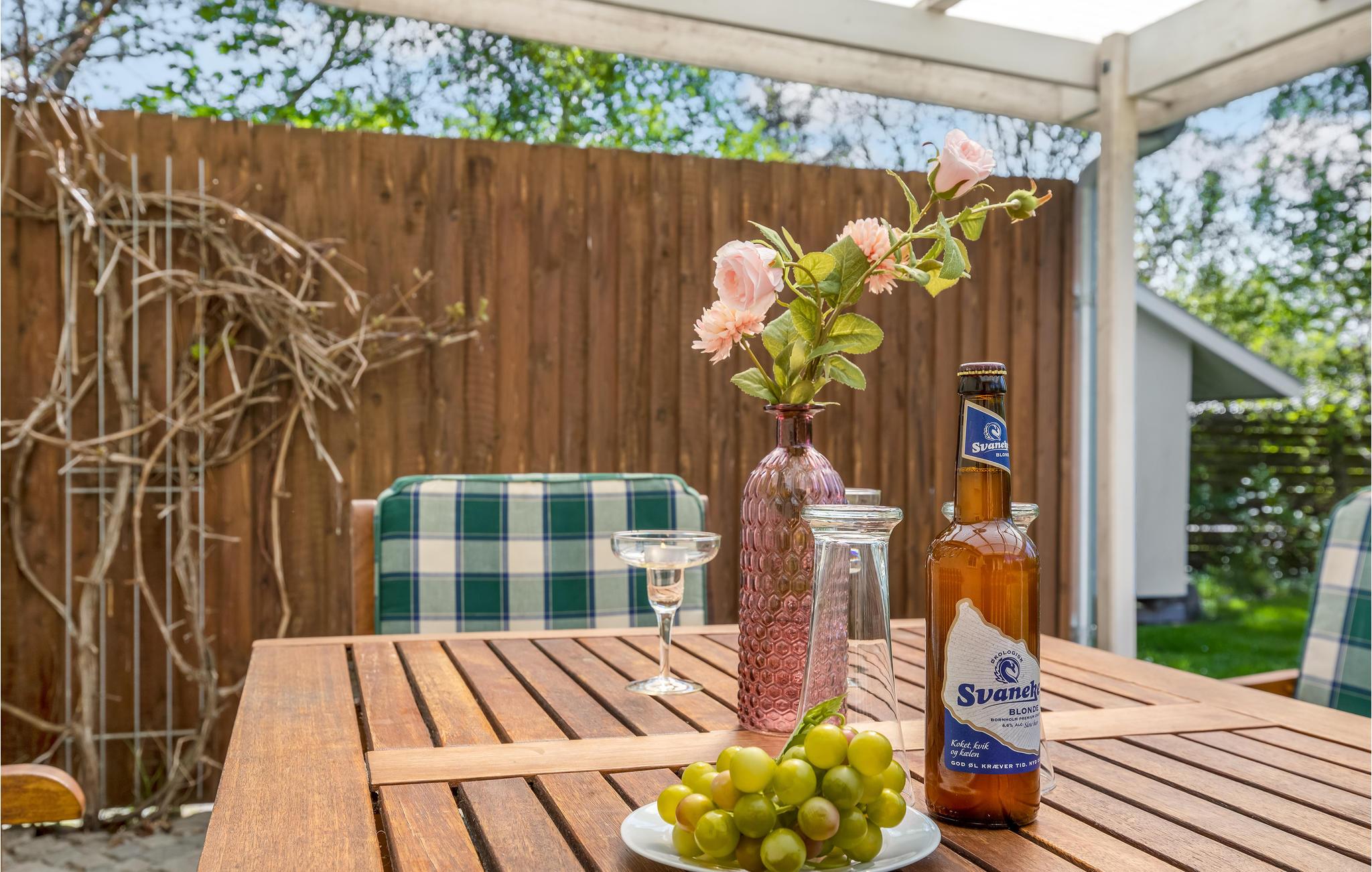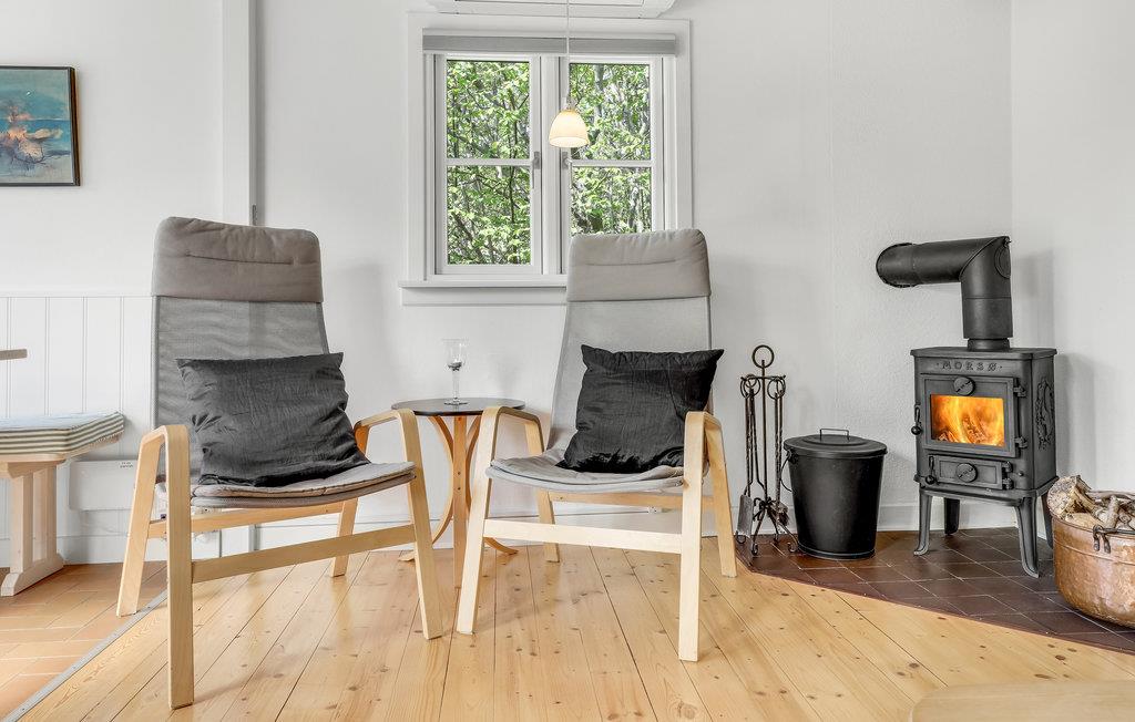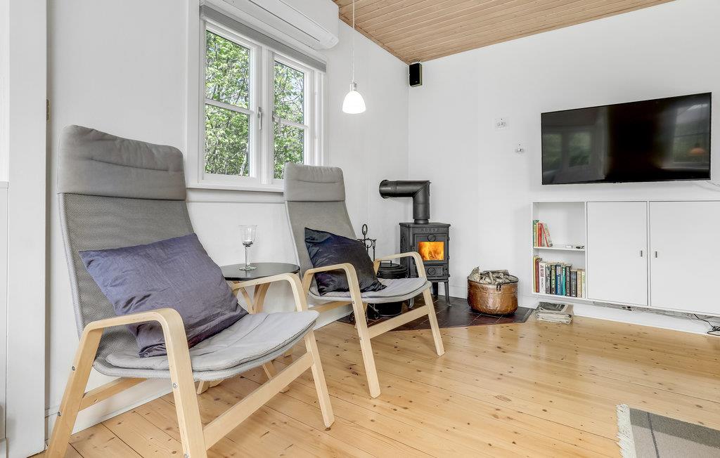 Charmerende sommerhus nær børnevenlig sandstrand i Stampen med brændeovn og overdækket terrasse.