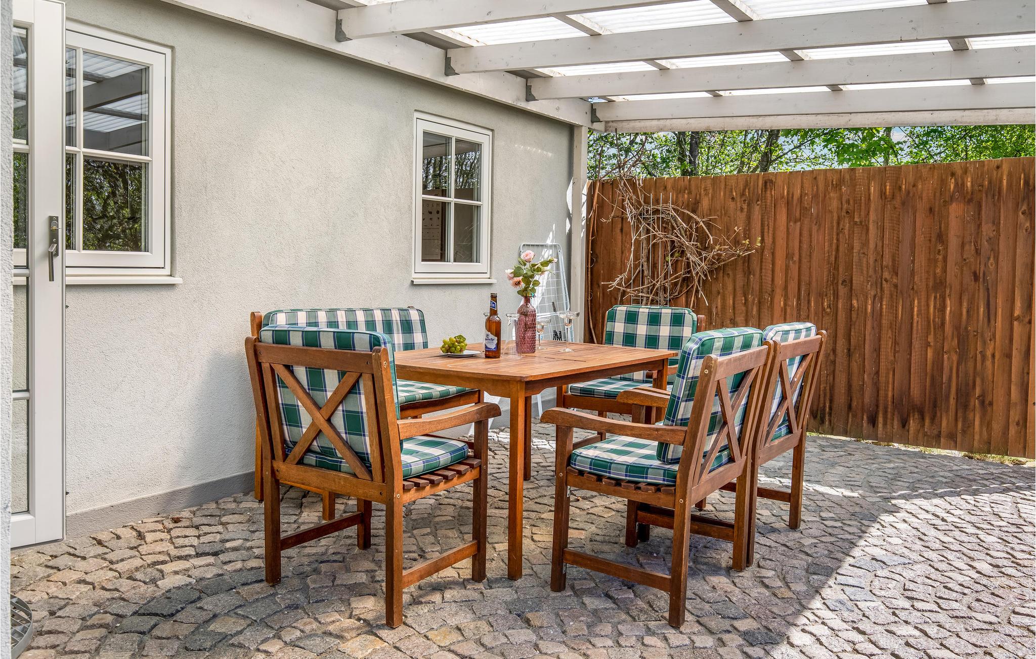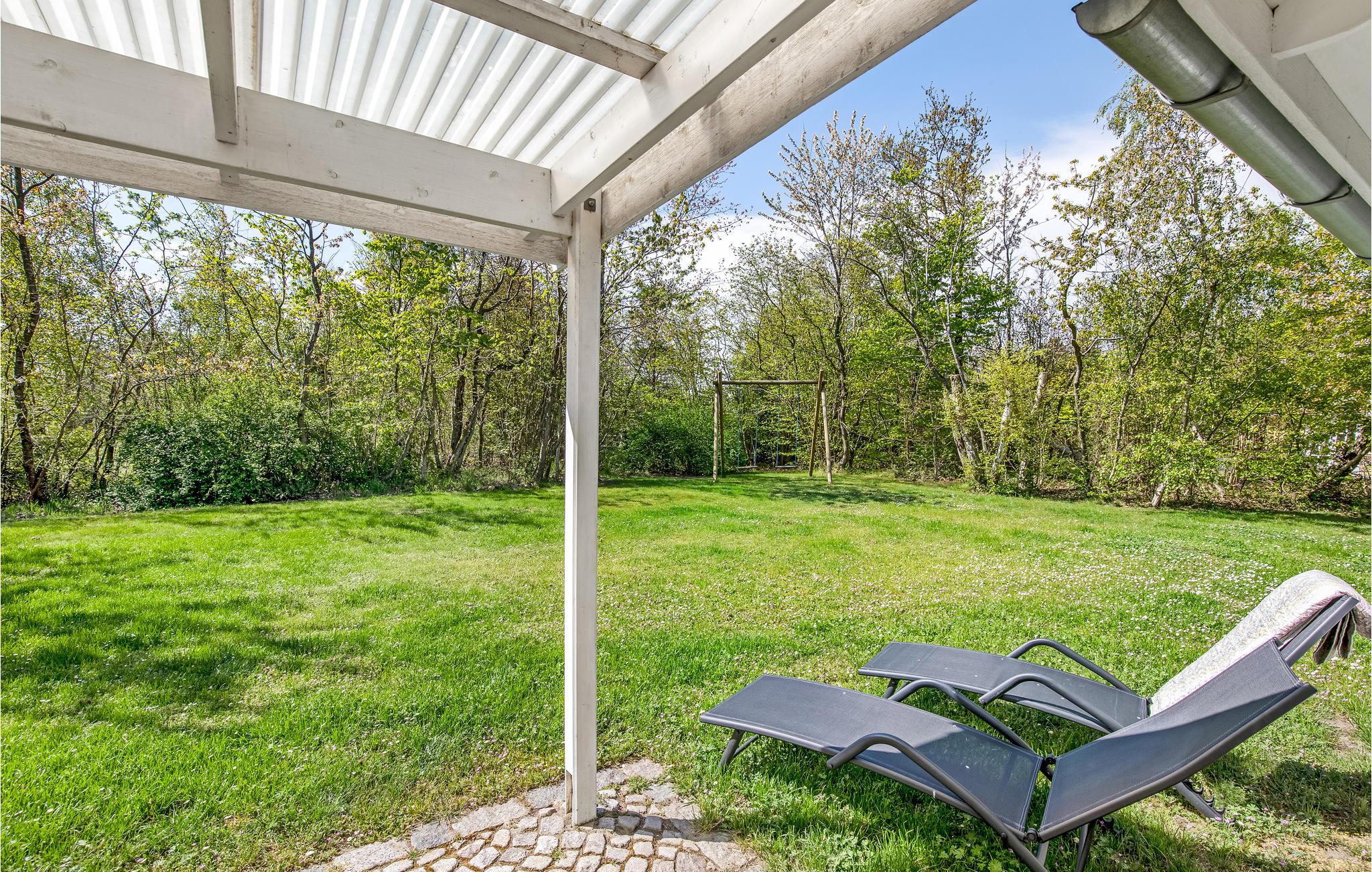 Overdækket og solrig terrasse med grill og havemøbler på rolig grund, med gyngestativ og plads til leg eller afslapning i liggestole.