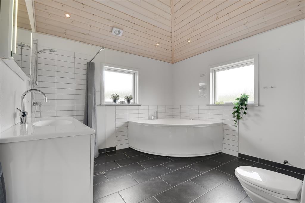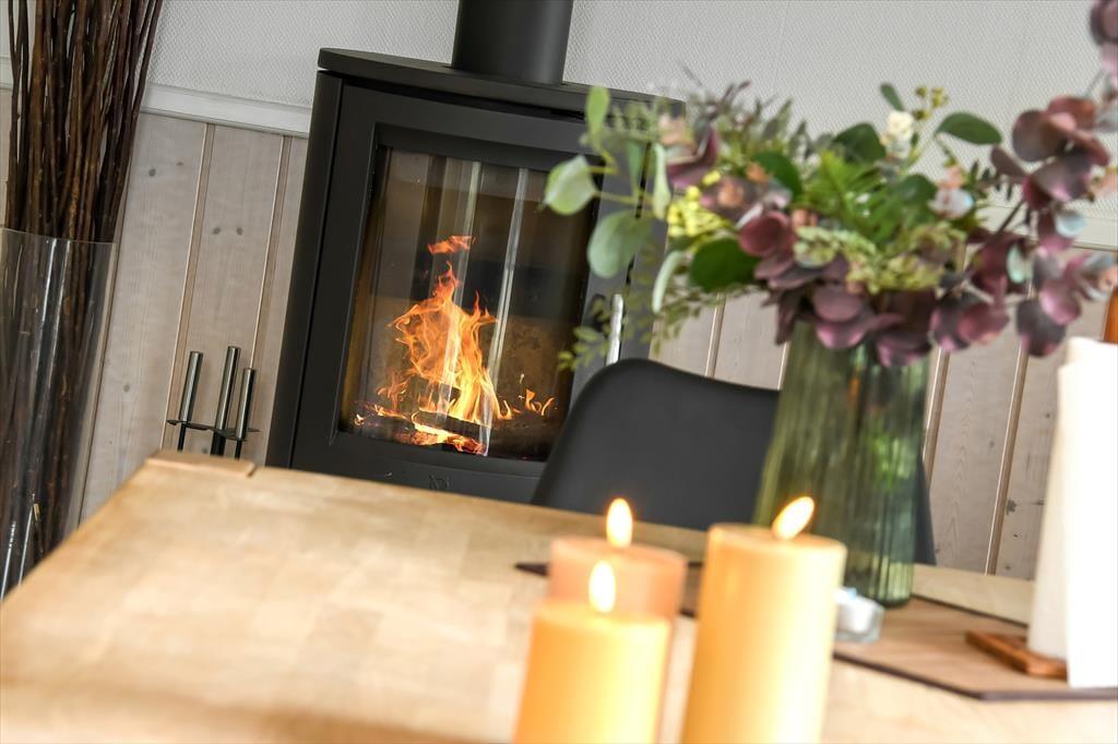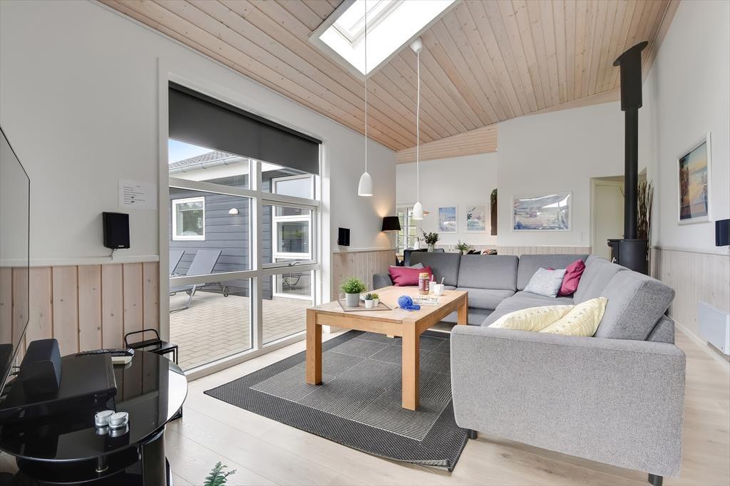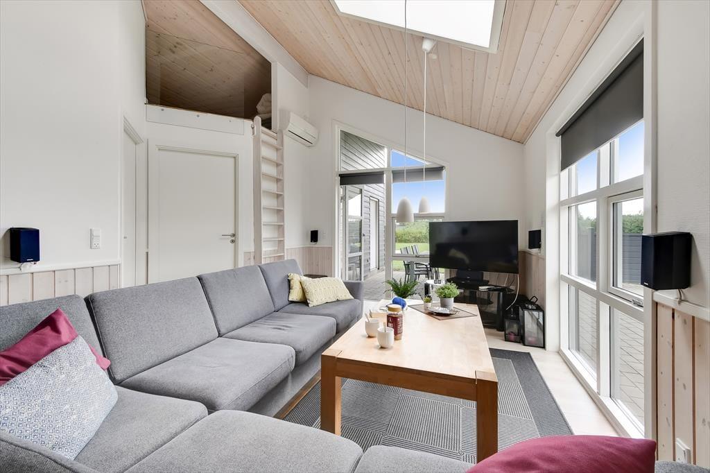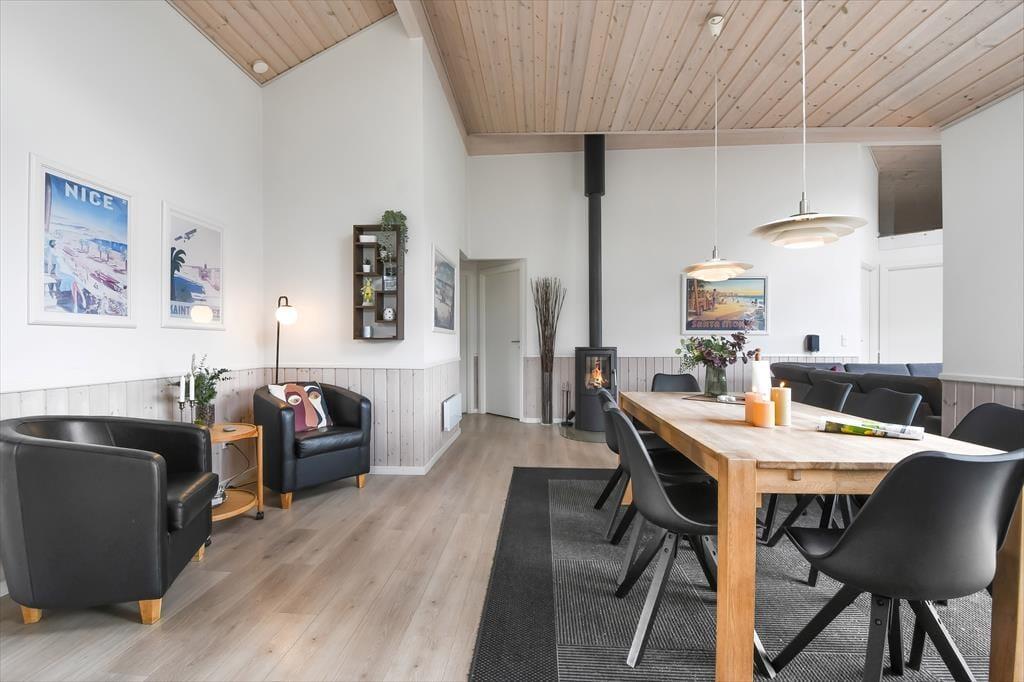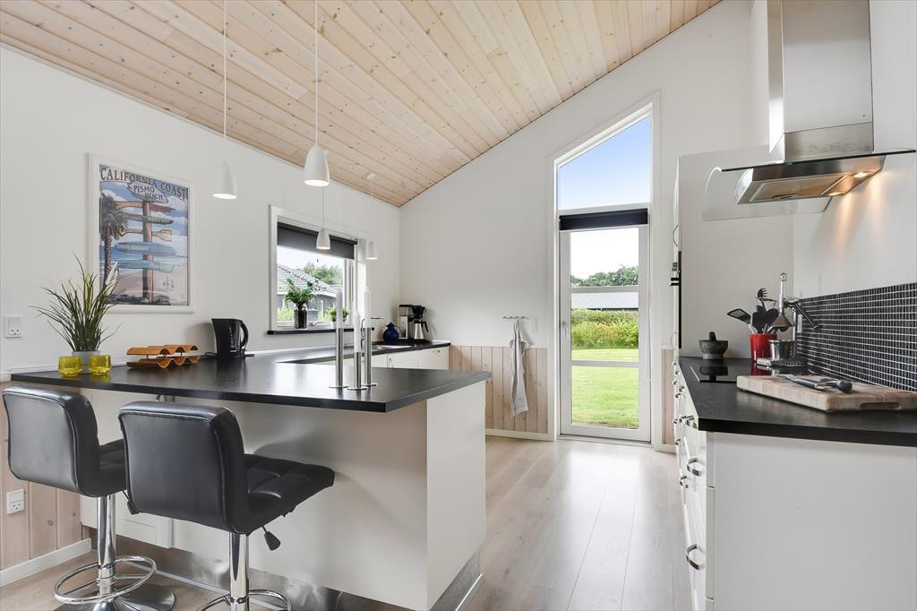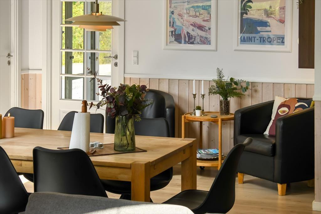 Allerede udefra står det klart, at der er tjek på tingene her på Rørkrogen 10. Sommerhuset præsenterer sig flot med mørk facade og hvide detaljer, og inden døre er atmosfæren lys og let. I opholdsafdelingen er der loft til kip og ovenlysvinduer såvel som store glaspartier, der skaber en god forbindelse til udearealerne. Det åbne køkken har godt med albueplads, så I kan sagtens være flere om at stå for madlavningen – hvis ikke du bare slår dig ned på en af barstolene for at holde kokken med selskab. Med brændeovn og en komfortabel sofaafdeling er der lagt op til masser af indendørs hygge, og når du trænger til at slappe fuldstændigt af, kan du gå i sauna eller tage en tilbagelænet pause i spabadet. Begge dele finder du på det største af husets to badeværelser, der begge ligger centralt placeret. Soveværelser er der fire af, og derfor passer planløsningen glimrende til otte personer.