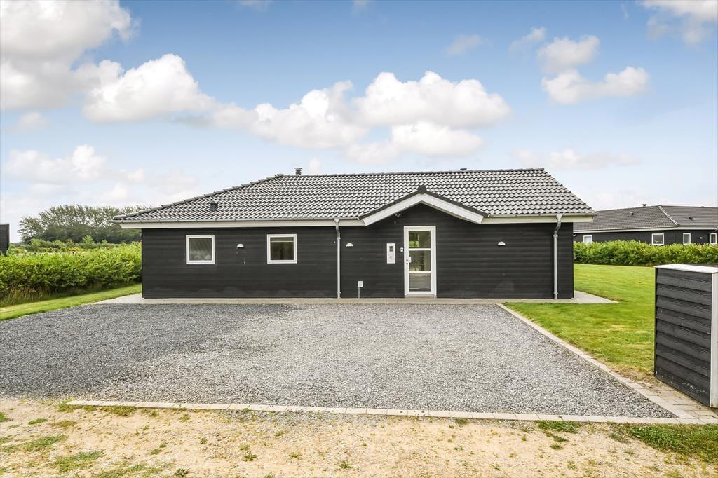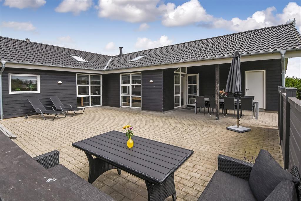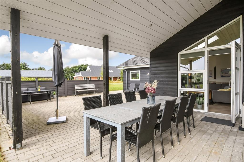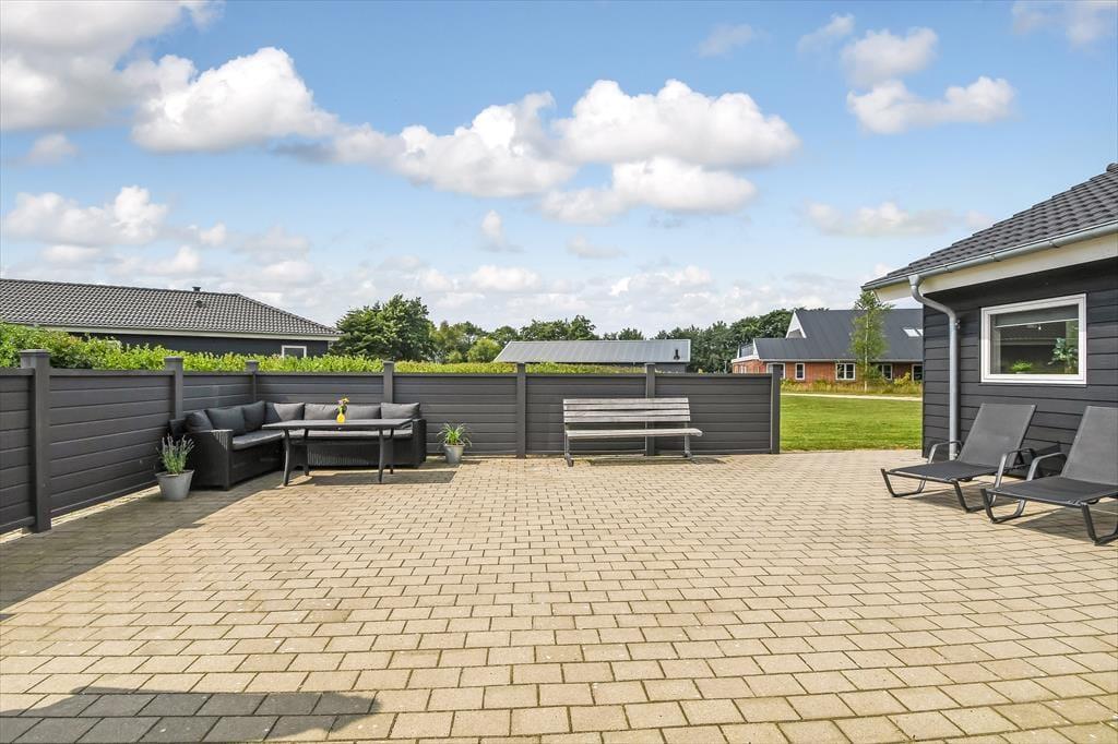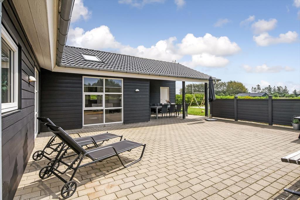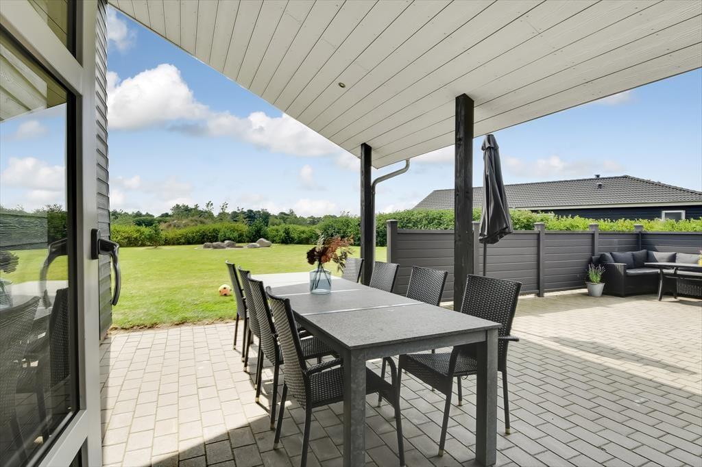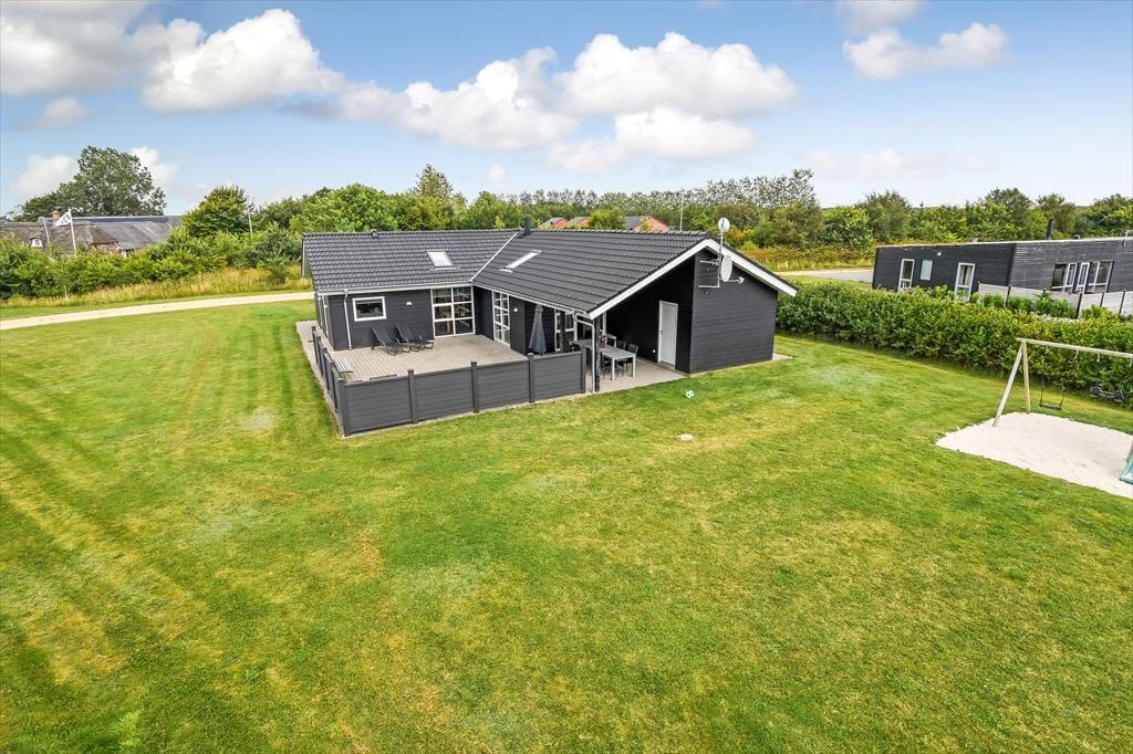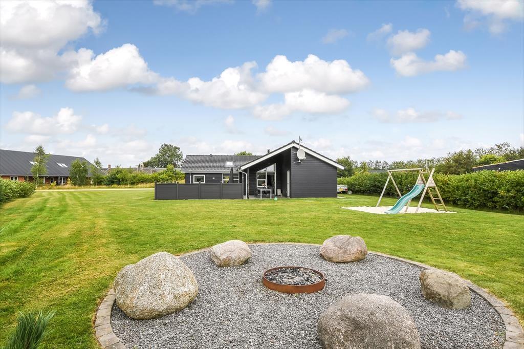Sommerhuset ligger på en stor og velanlagt grund med en grøn græsplæne og en omkransende hæk. Hvis du har børn med på ferie, vil de sikkert straks få lyst til at smutte ud for at spille bold eller lege fangeleg, og der er også gynger, rutsjebane og sandkasse, som de yngste kan hygge sig med. Bålstedet er et hyggeligt sted at samles hele familien for at bage snobrød eller riste skumfiduser – for eksempel en klar efterårsdag eller en stille aften i sommertusmørket. Den store og delvist overdækkede terrasse indbyder ligeledes til mange gode stunder, uanset om du trænger til at sidde roligt med en kølig iskaffe og en god bog eller dækker op til en festlig frokost med dine kære.
