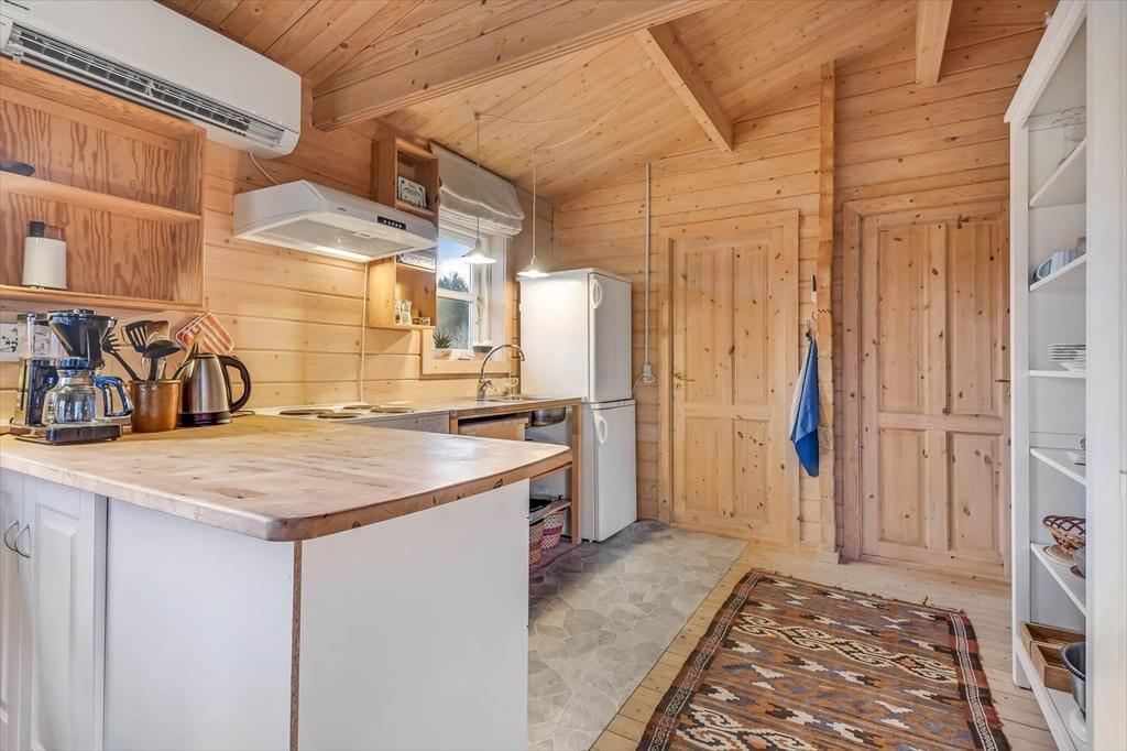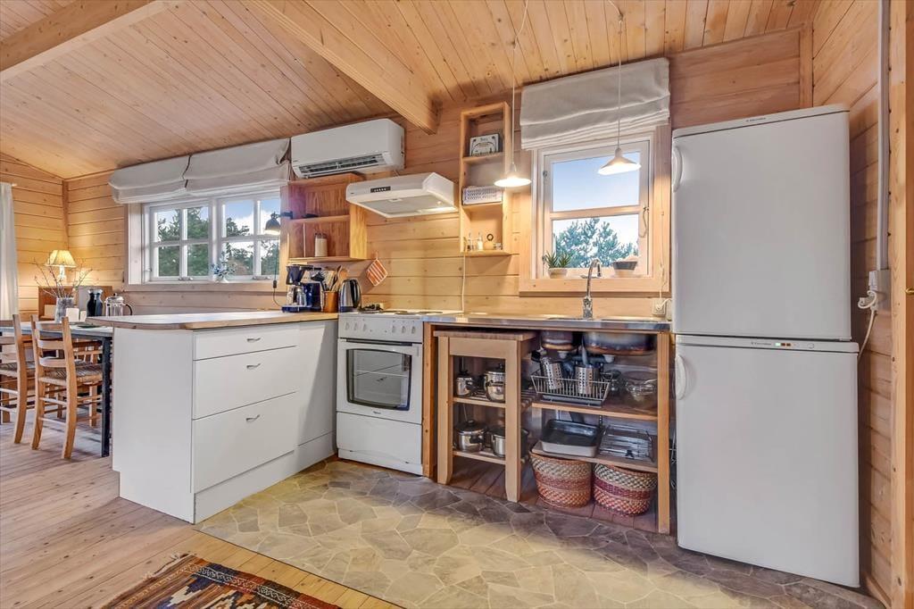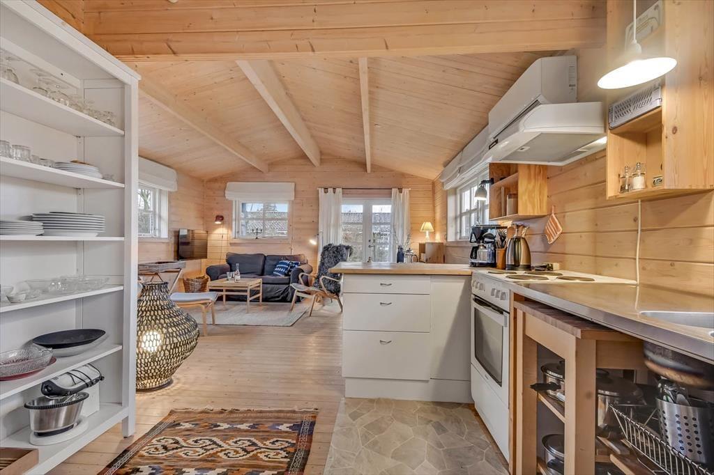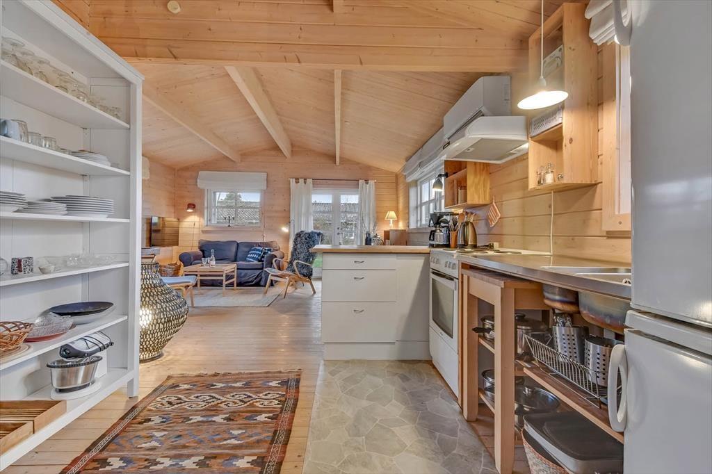 Indenfor mødes du af en varm og indbydende atmosfære, der emmer af klassisk sommerhusstemning. Den hyggelige stue med sine bløde møbler og lyse trævægge skaber de perfekte rammer for afslappende stunder – måske med en god bog eller en spændende film på tv’et. Brændeovnen spreder varme på kølige dage og gør det ekstra hyggeligt at opholde sig indendørs. Køkkenet er veludstyret og inviterer til, at I sammen kan tilberede lækre måltider, som kan nydes ved spisebordet med udsigt til haven. Her er alt, hvad I behøver for at sætte farten ned og lade roen falde over jer.