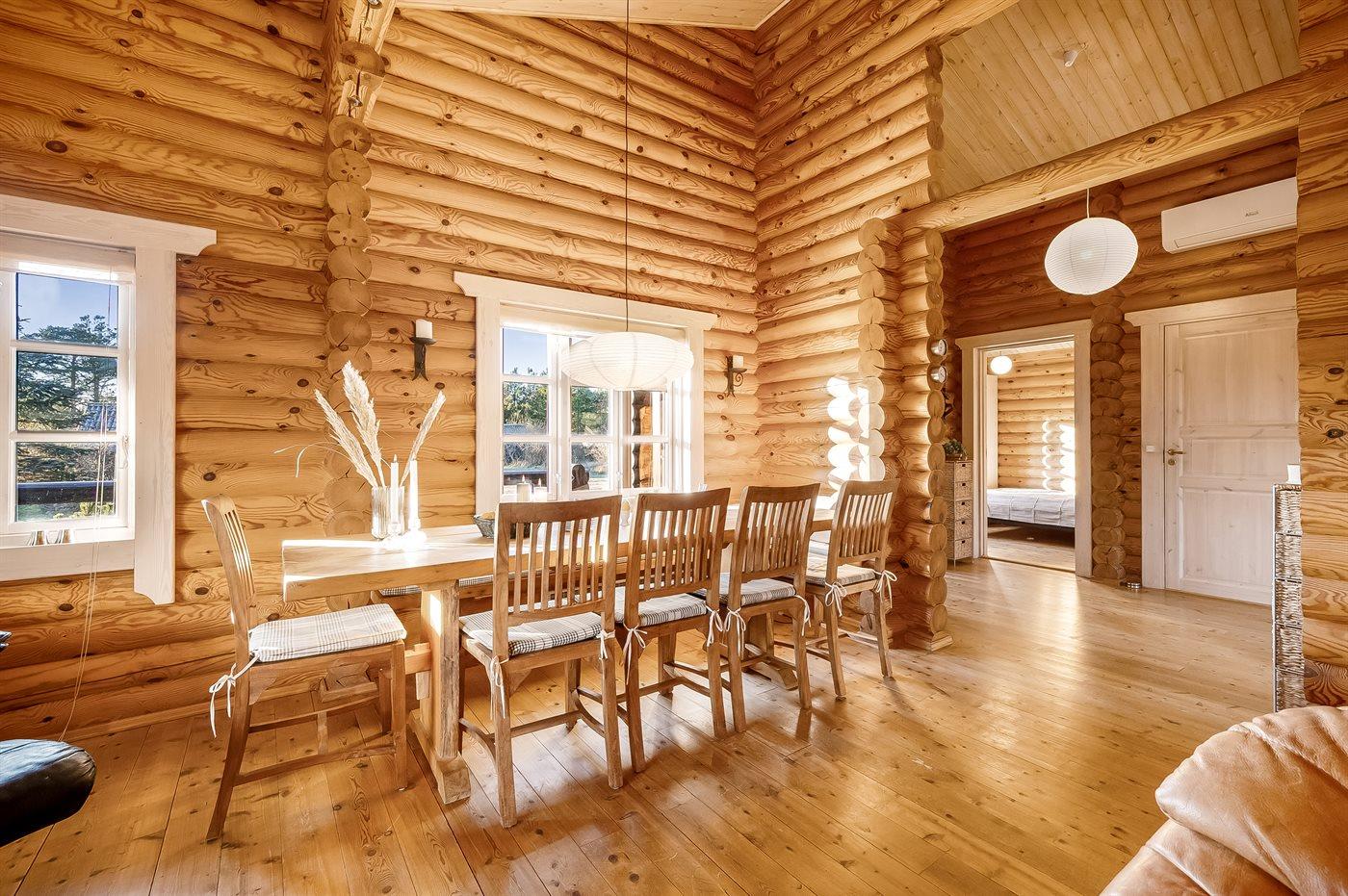Hyggeligt bjælkesommerhus nær fjorden med plads til 6 personer og charmerende naturoplevelser i rolige omgivelser.