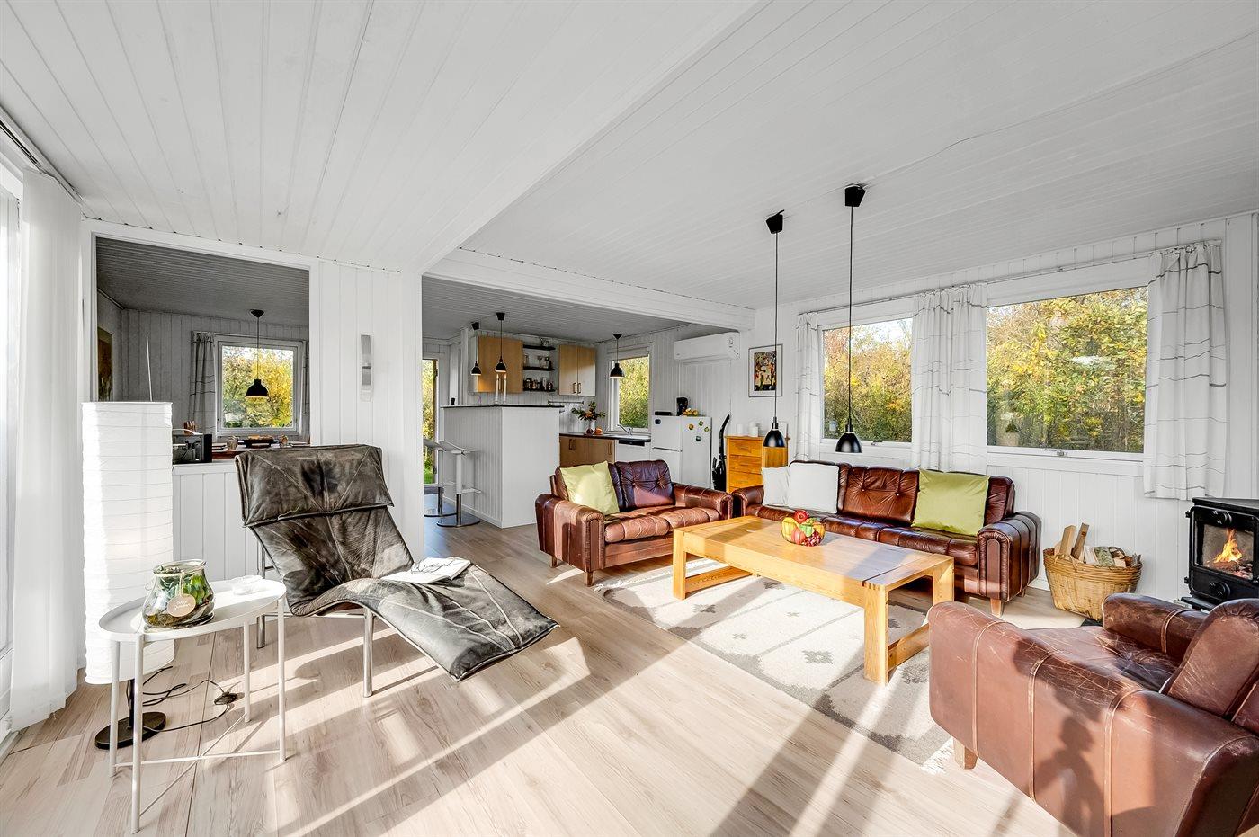 Hyggeligt sommerhus nær fjorden med terrasse, brændeovn og energivenlig varmepumpe i et roligt naturområde.