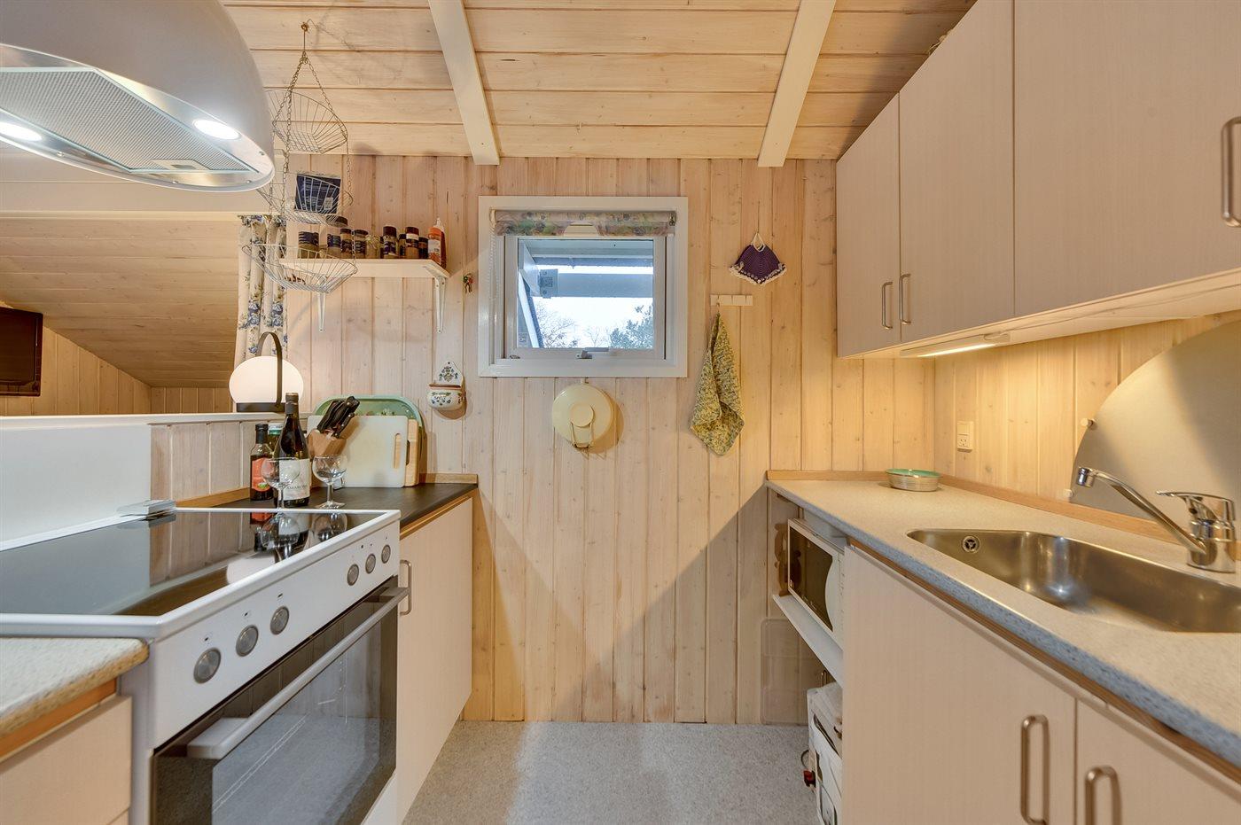 Køkkenet er udstyret med 1 køleskab. Der er 4 elkogeplader, bageovn, mikrobølgeovn.