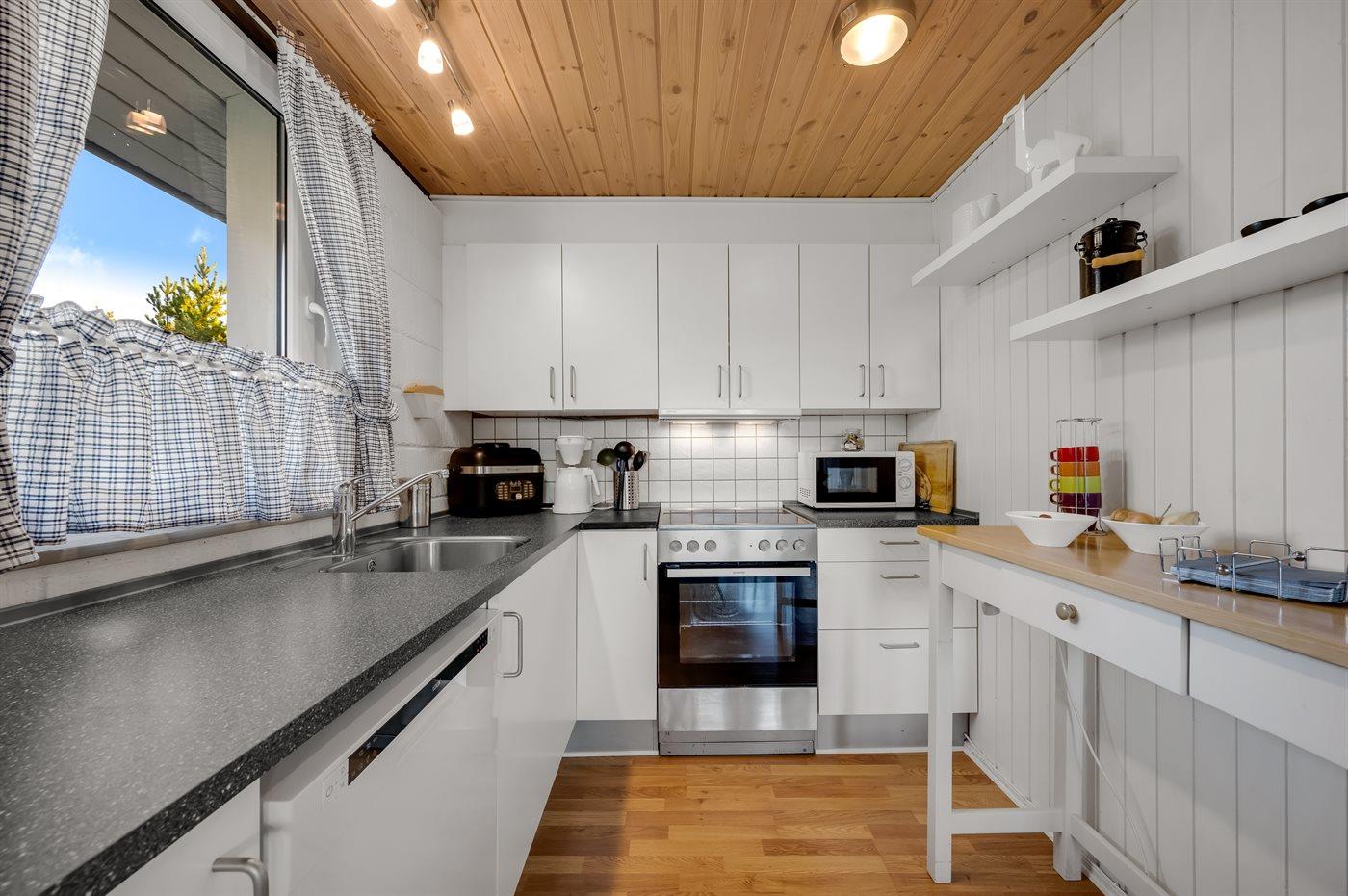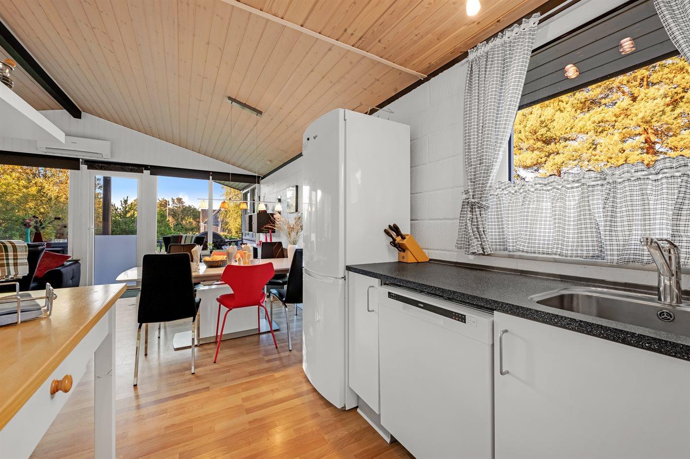 Køkkenet er udstyret med 1 køleskab. Der er 4 keramiske kogeplader, varmluftovn, mikrobølgeovn, Airfryer samt opvaskemaskine.
